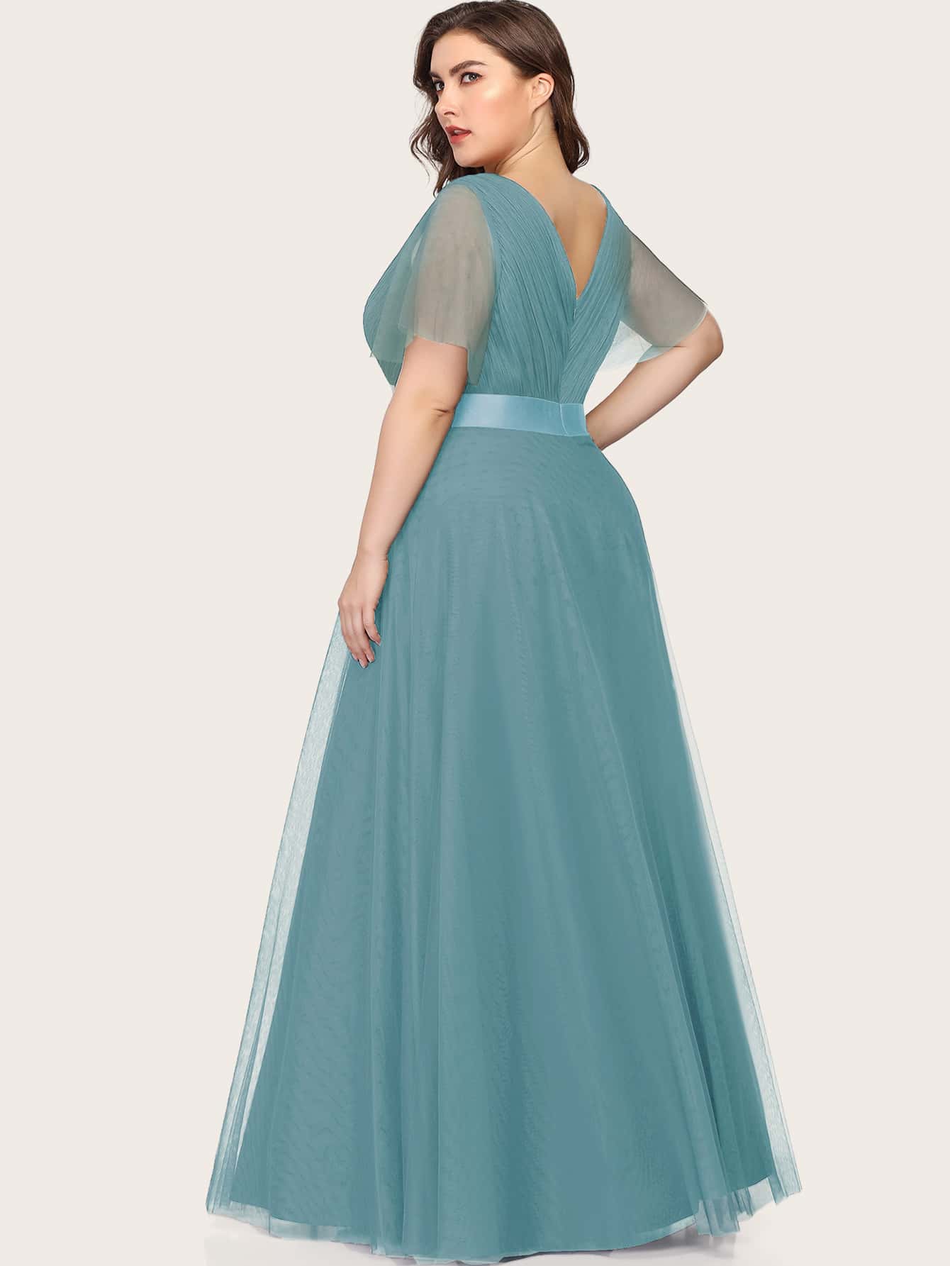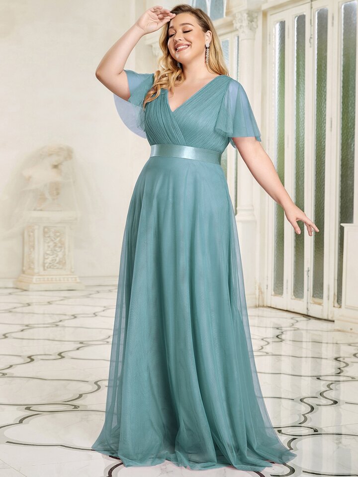 Plus Size Ruffle Bust High Waist Blue Bridesmaid Dress, Suitable For Autumn Wedding Party Guests