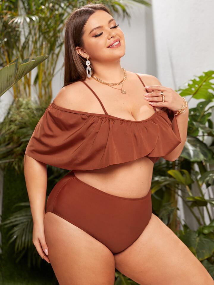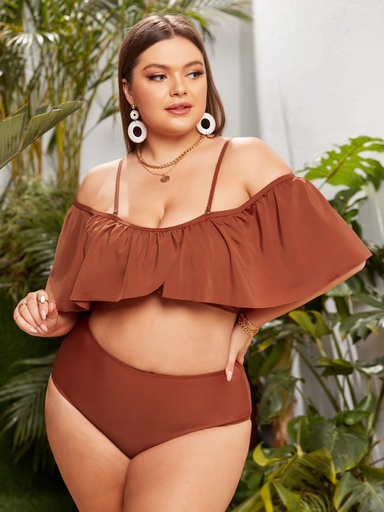 Plus Size Solid Ruffle Trim Bikini Set Summer Beach
