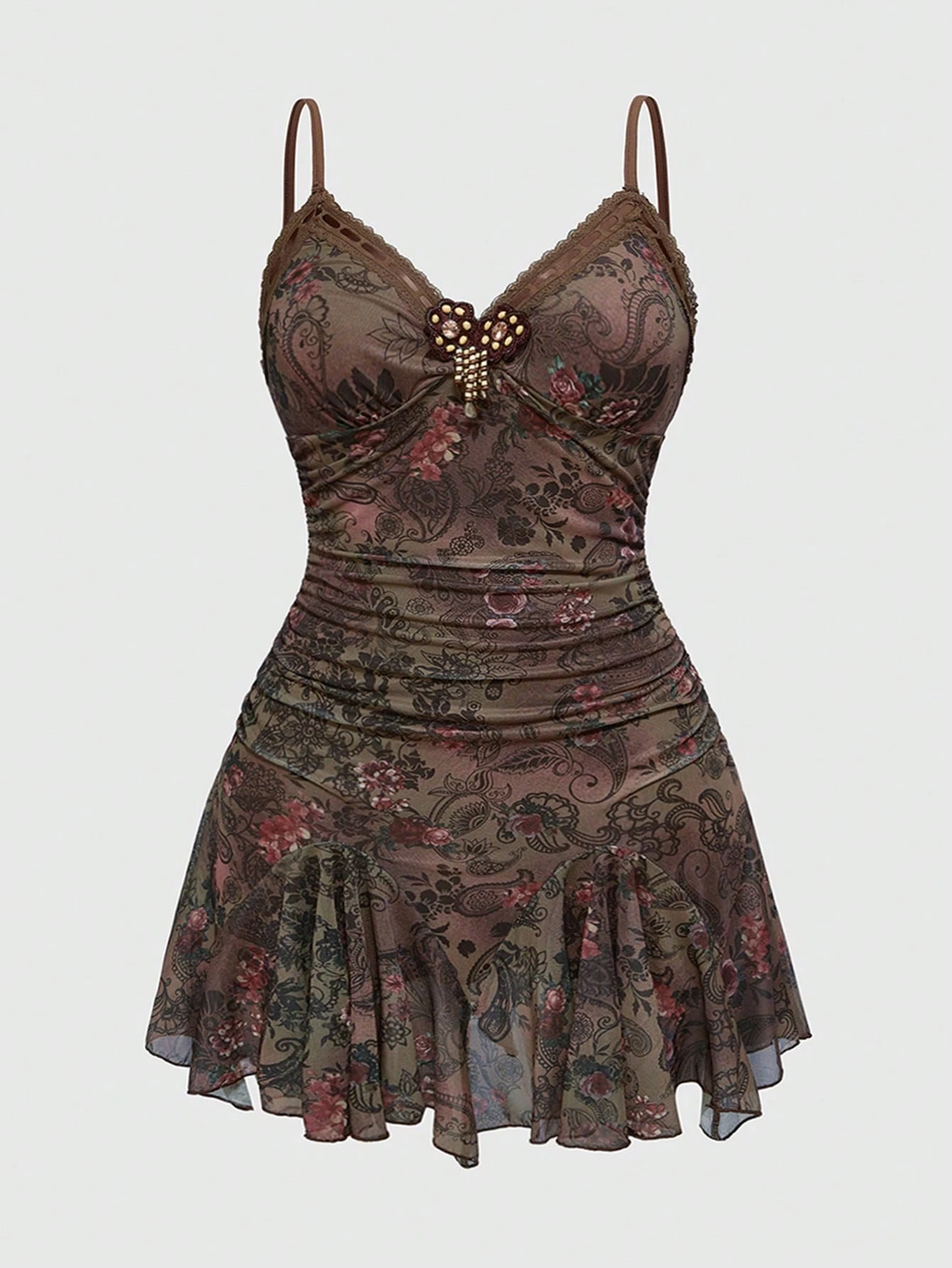 Plus Size Women Vintage Hippie Ruffled Strap Lace Paisley Print Mini Dress
