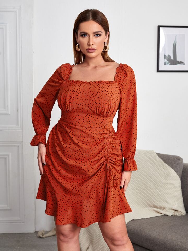 Plus Square Neck Lettuce Trim Drawstring Ruffle Hem Dress