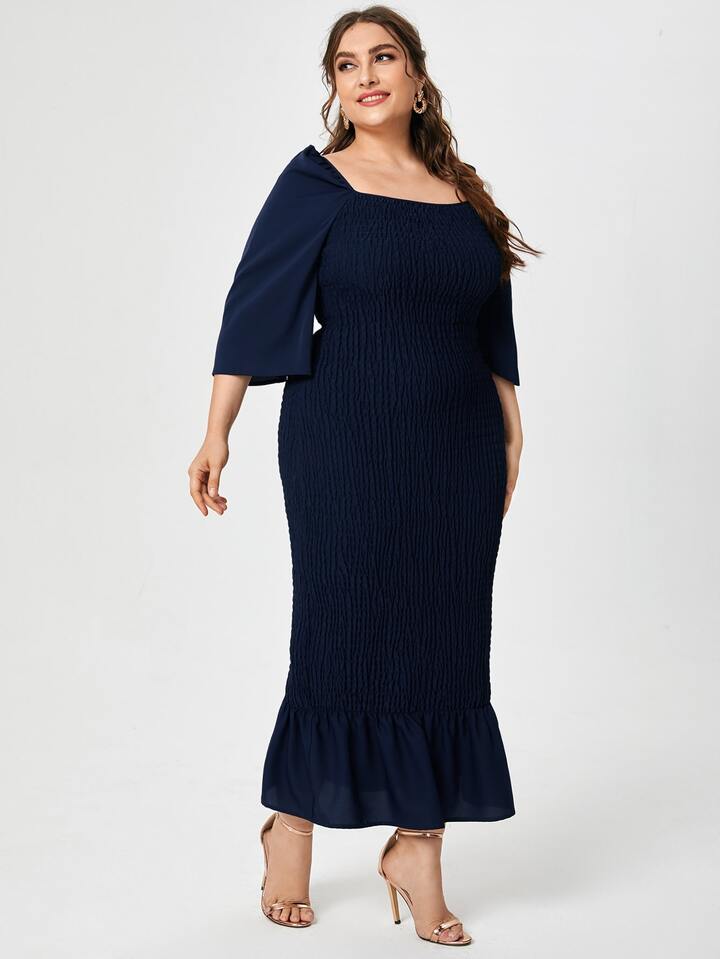 Plus Square Neck Shirred Mermaid Hem Dress