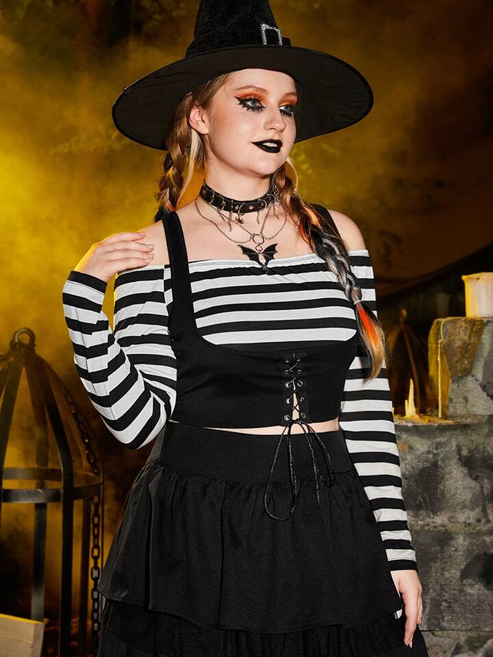 Plus Striped Print Lace Up Front 2 In 1 Crop Top
