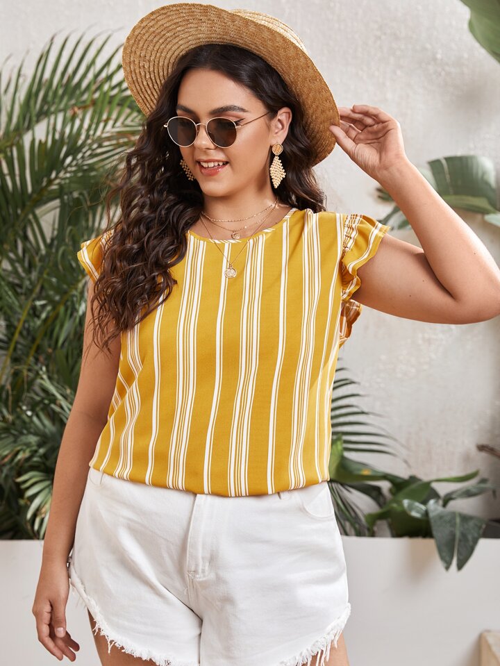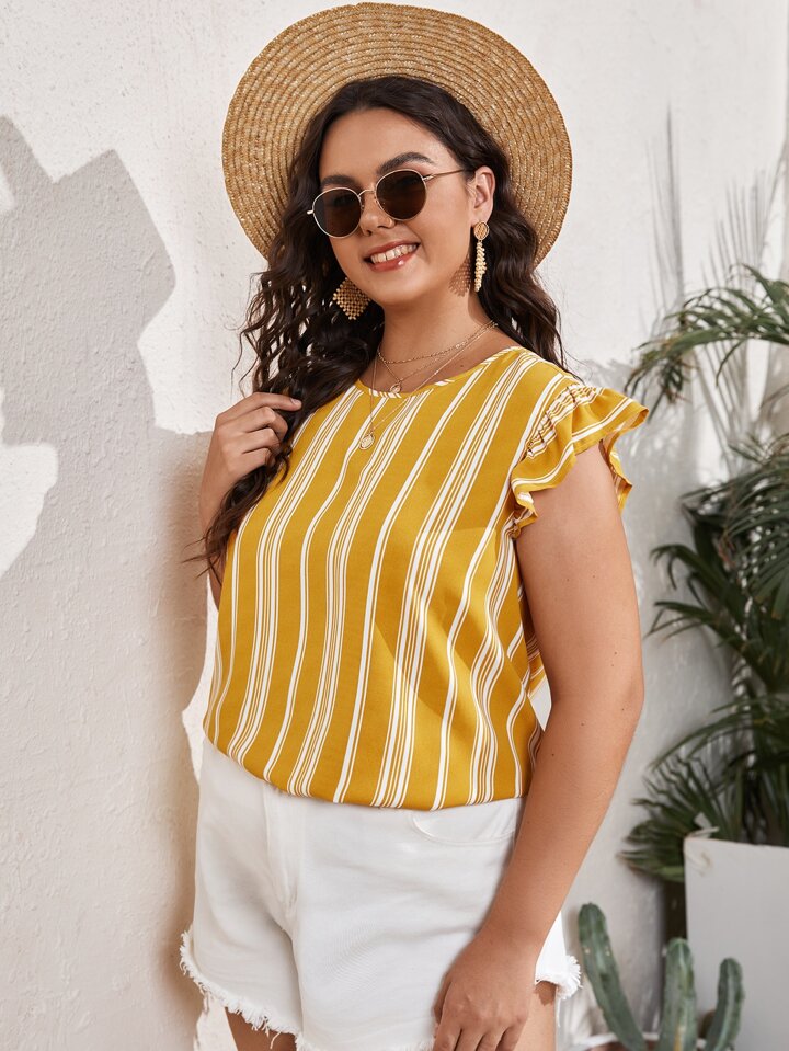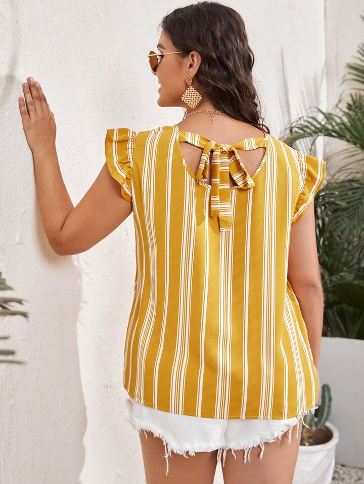 Plus Vertical Striped Tie Back Ruffle Trim Armhole Top