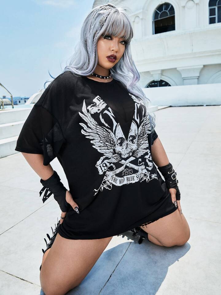Plus Wings & Skull Print Mesh Insert Drop Shoulder Tee, School