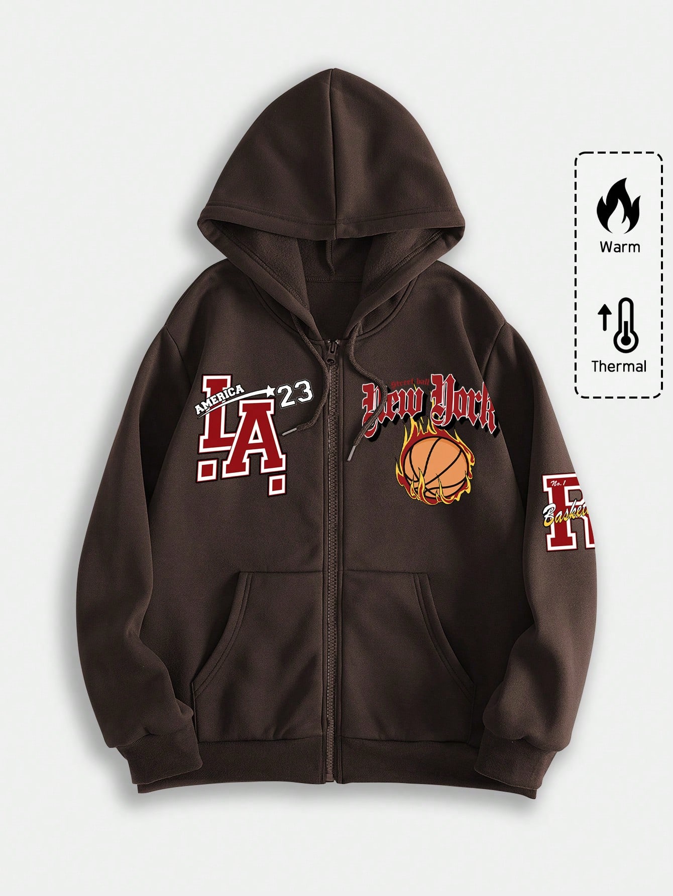 Prep Men Basketball & Letter Graphic Zip Up Thermal Lined Drawstring Hoodie, School, For Fall Winter