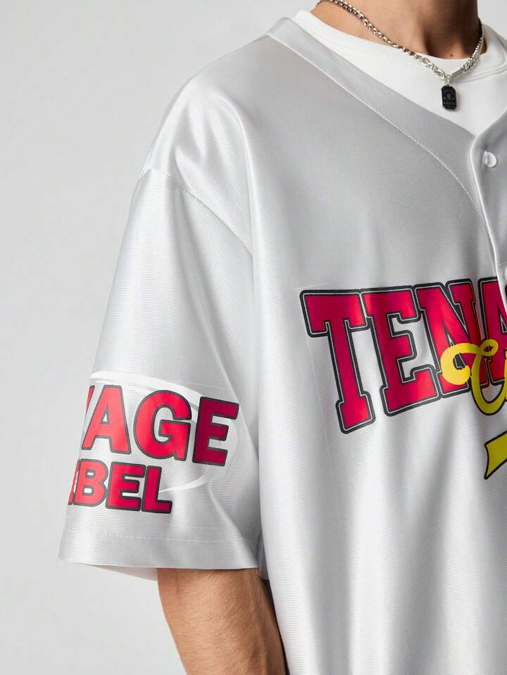 Prep Men's Jersey Button Front Short Sleeve Letter Print Top And Shorts Set, Minimalist Style