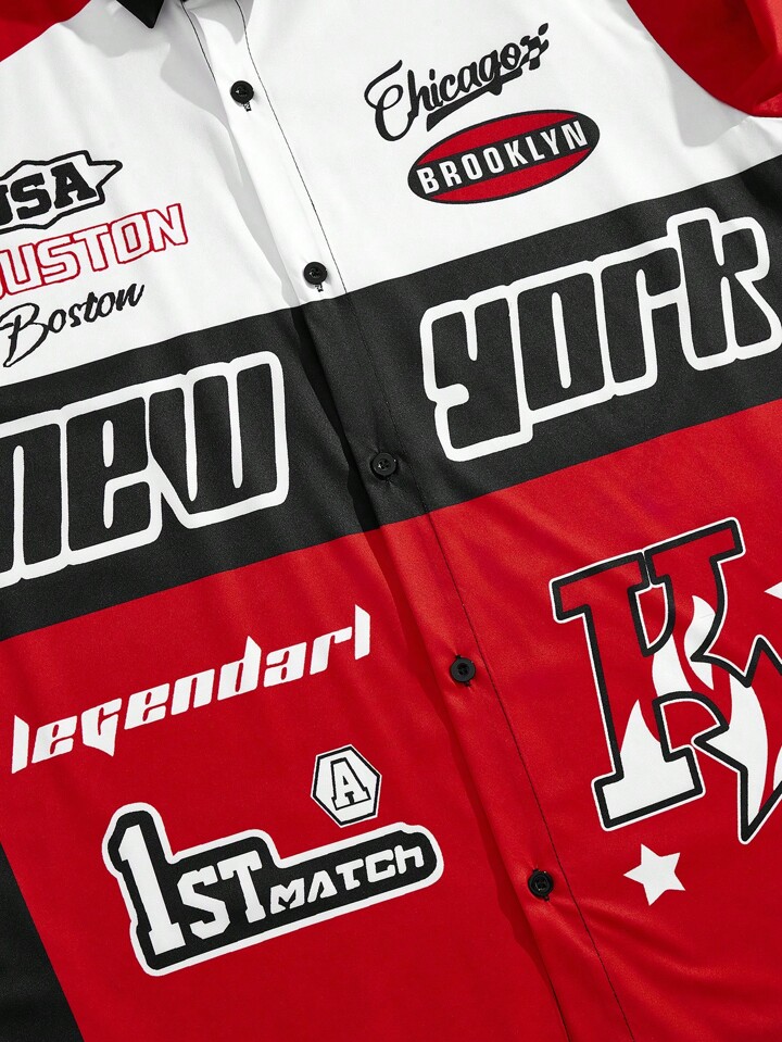 Prep Men's Racing Letter Print Color Block Button Short Sleeve Baseball Shirt, Casual