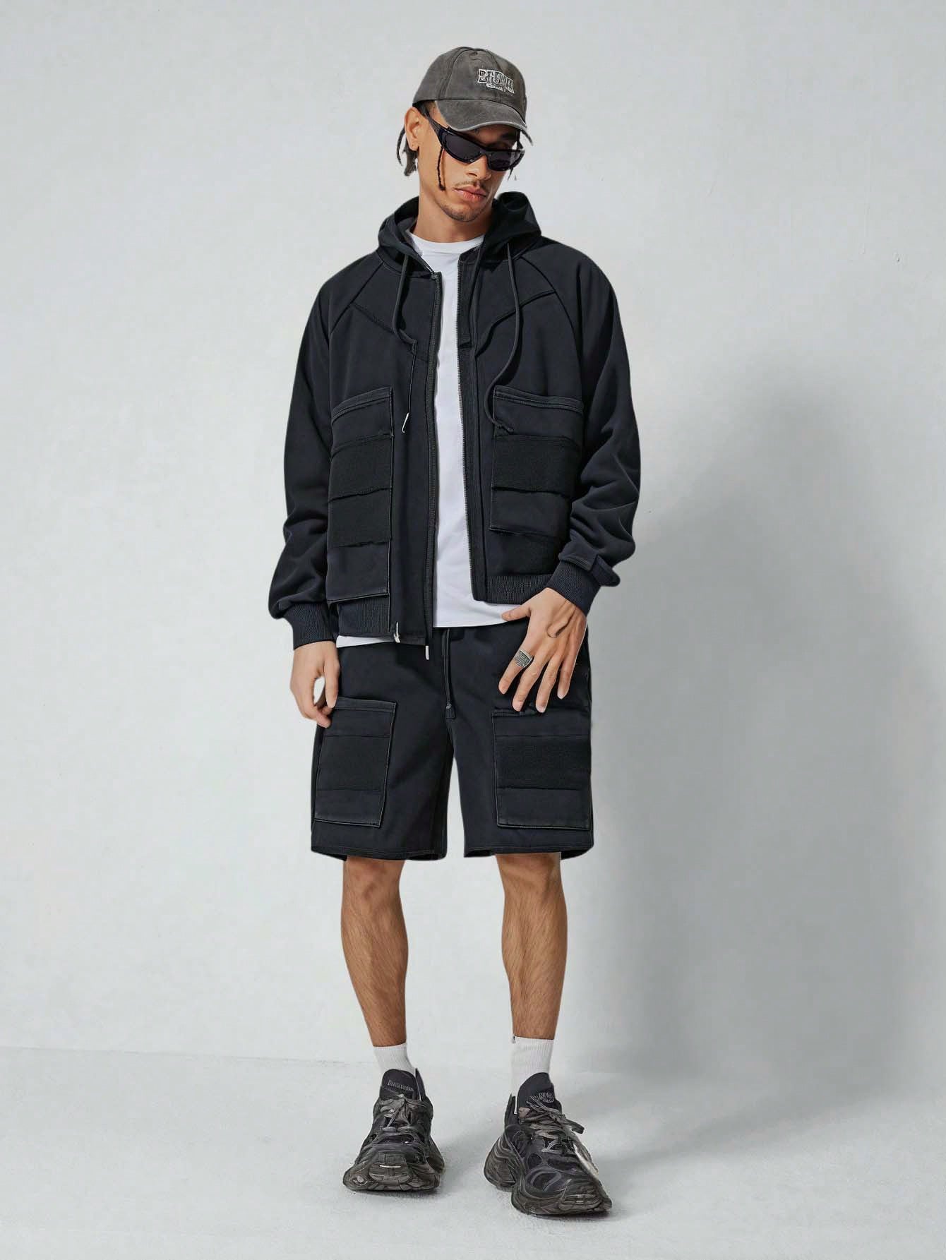 Prep Men's Solid Color Long Sleeve Zip Front Hooded Sweatshirt & Shorts 2pcs Casual Suit
