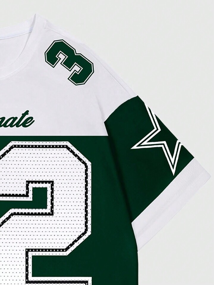 Prep Men's Solid Color Splicing Round Neck Short Sleeve Numeric Print Minimalist Casual Top