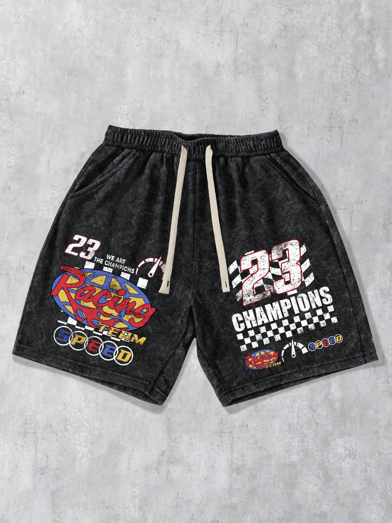 Prep Men's Street Life Racing Letter Print Drawstring Waist Pocket Casual Shorts