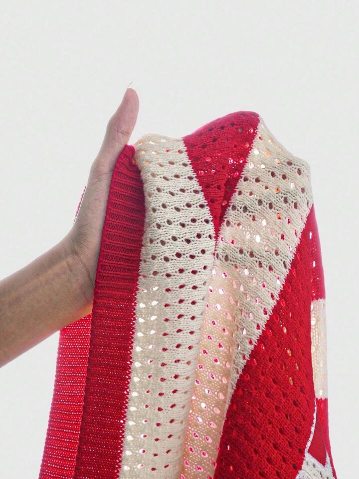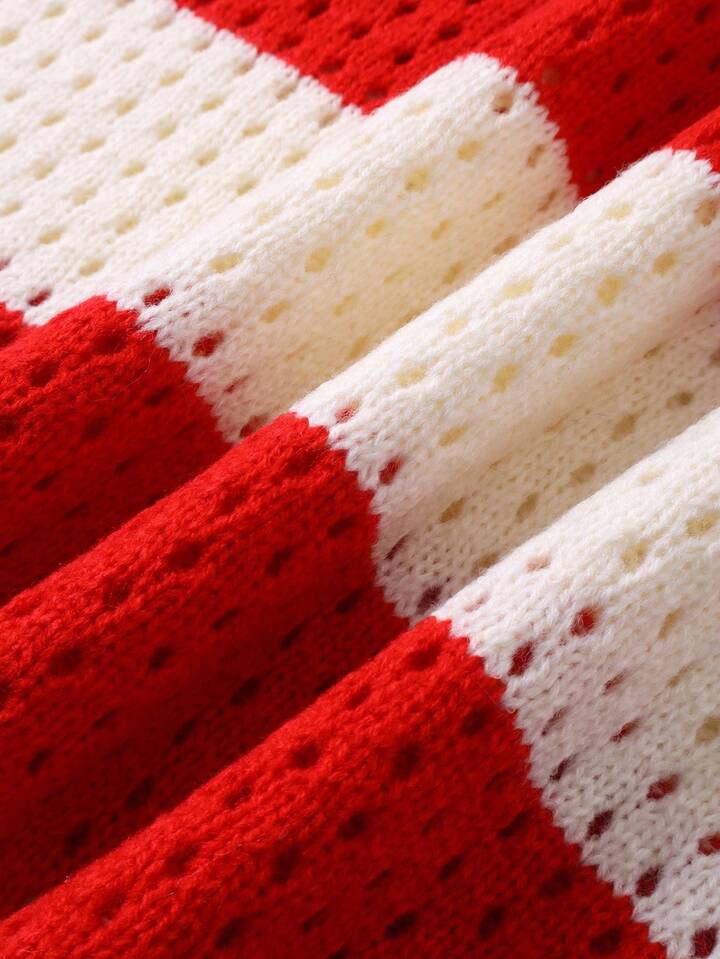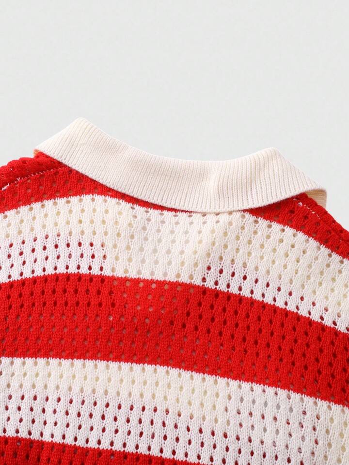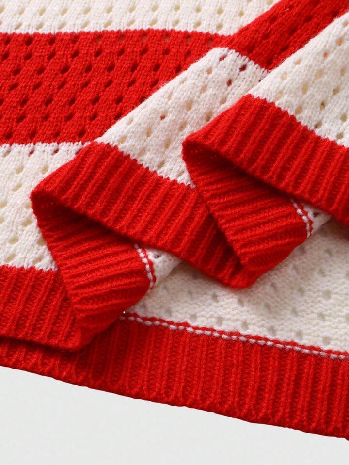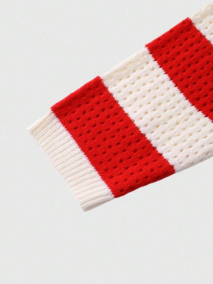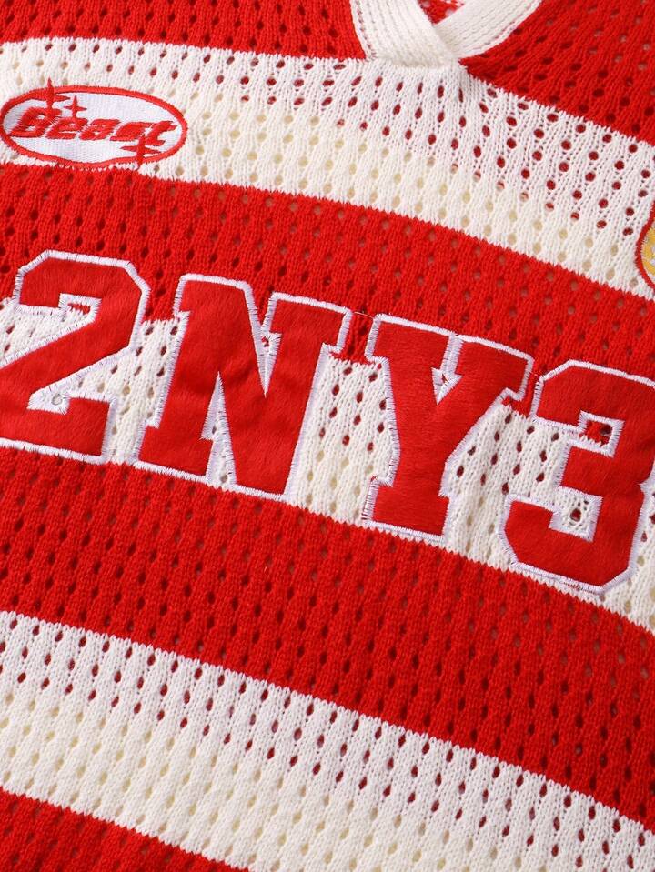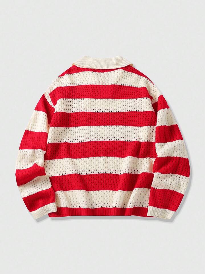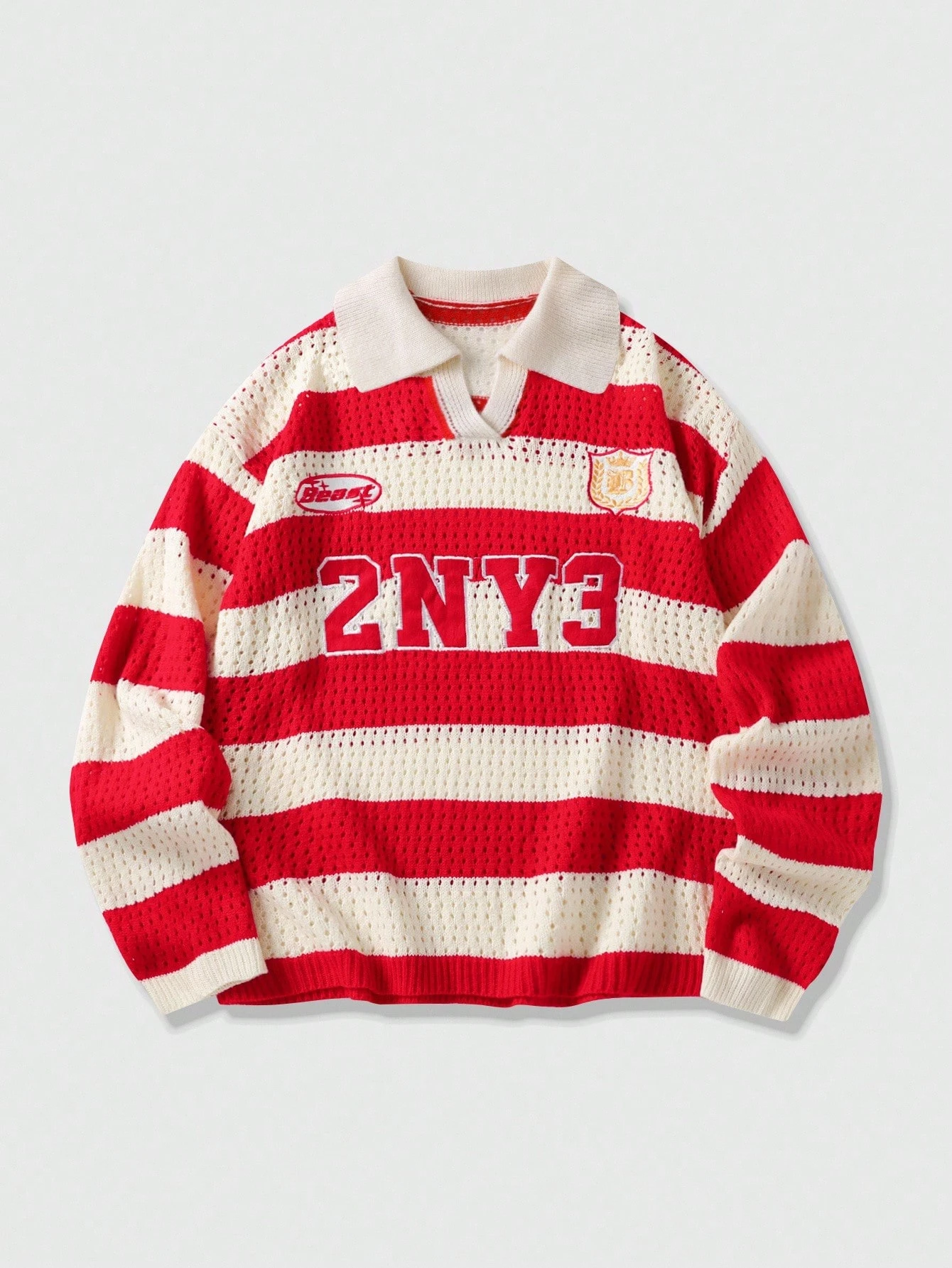 Prep Men's Striped Letter Embroidered Loose Hollow Knit Sweater, Fall Winter