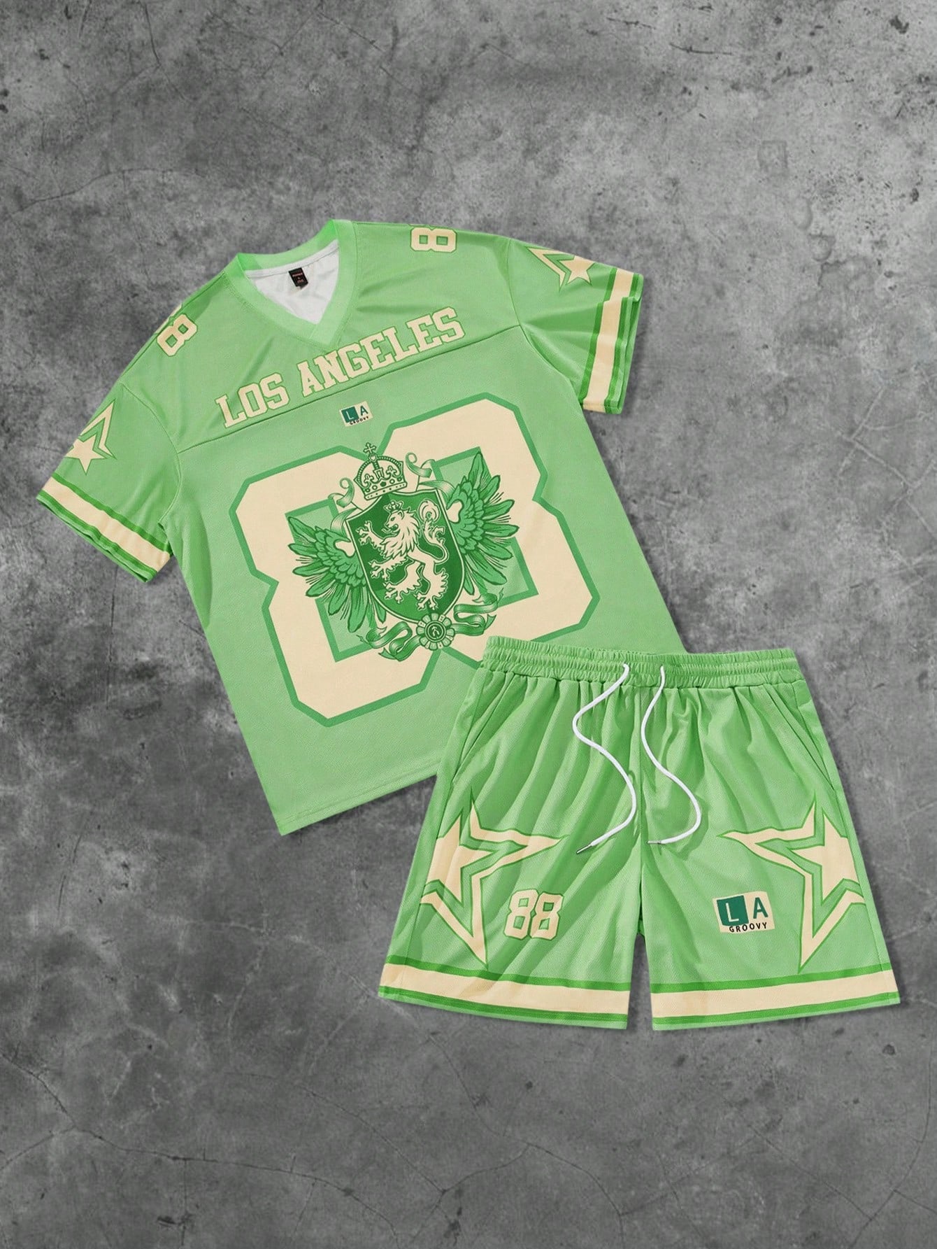 Prep Men's Summer Sports College Style Badge & Letter Print V-Neck Short Sleeve T-Shirt And Drawstring Waist Shorts Basketball Uniform Set