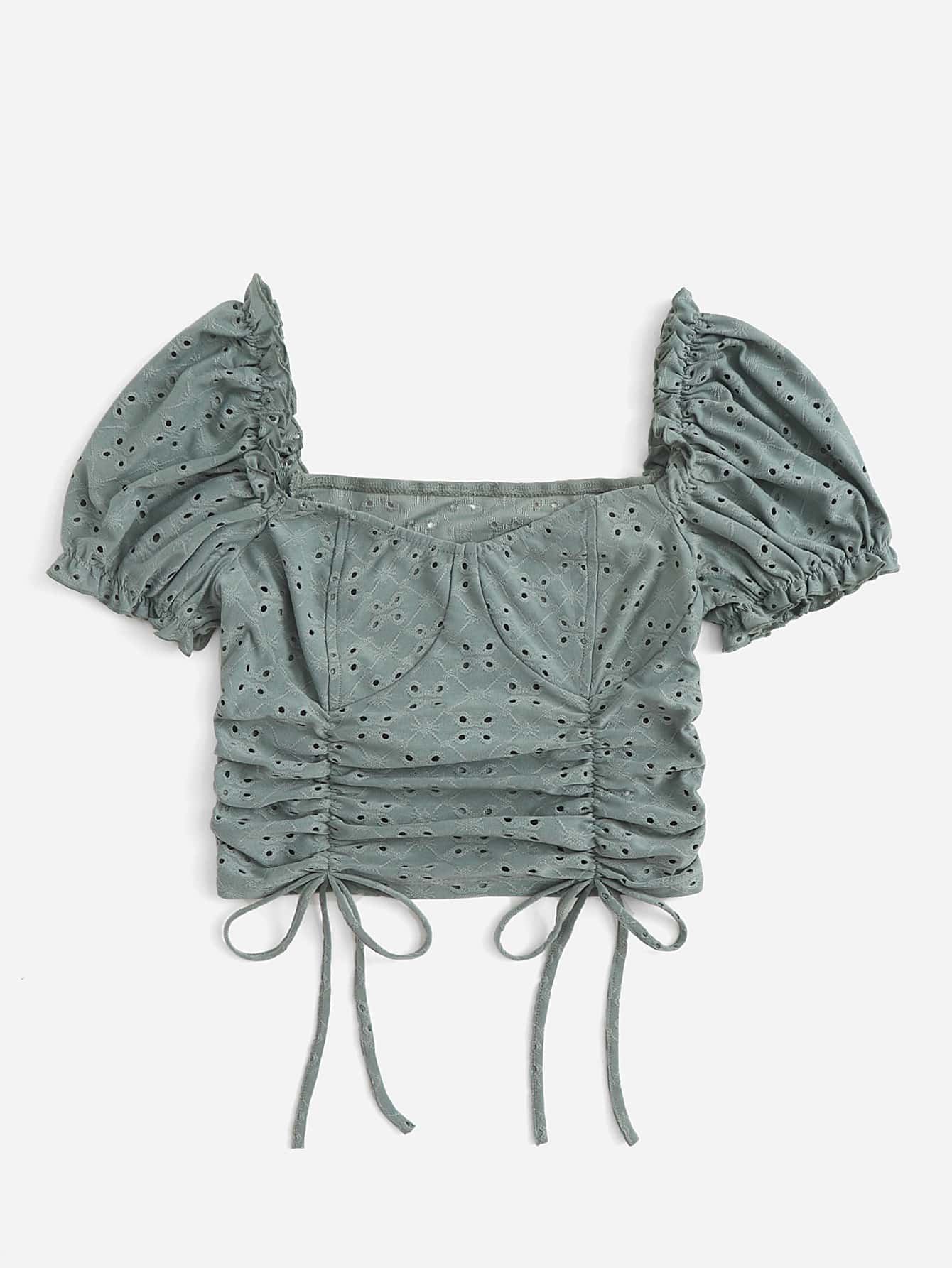 Puff Sleeve Frill Detail Drawstring Ruched Crop Top