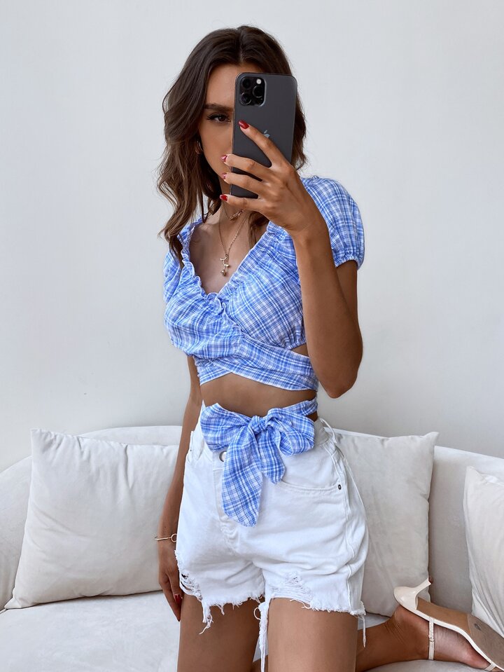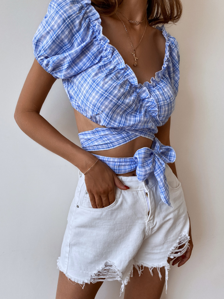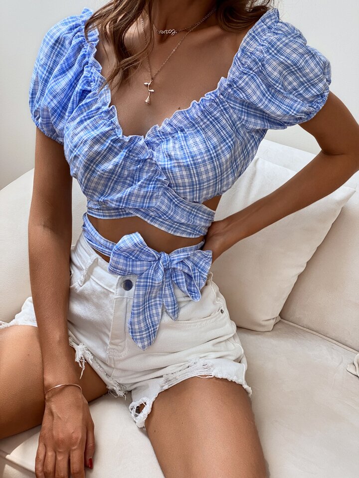 Puff Sleeve Frill Trim Wrap Crisscross Tie Front Crop Top