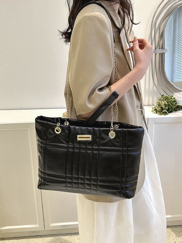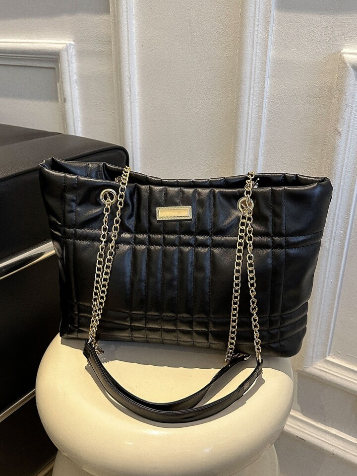 Quilted Shoulder Tote Bag Chain Strap Metal Decor