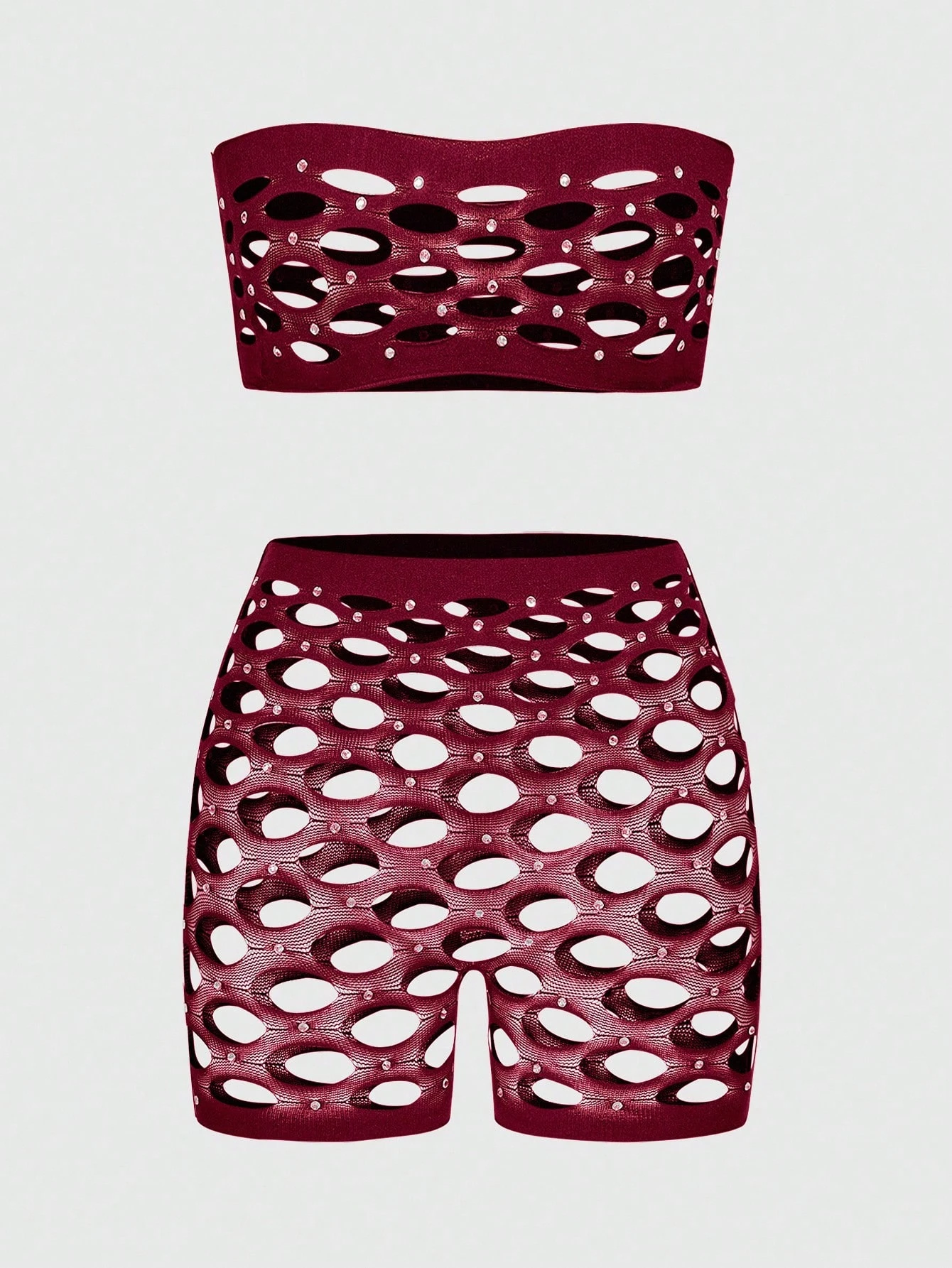ROMWE Avant Fashionable Mesh Rhinestone Decorated Elastic Stretch Sexy Women's Lingerie Set For Rave