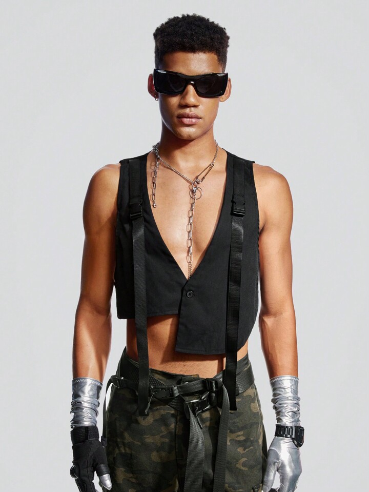 ROMWE Avant Guys Buckle Tape Strap Detail Vest Jacket