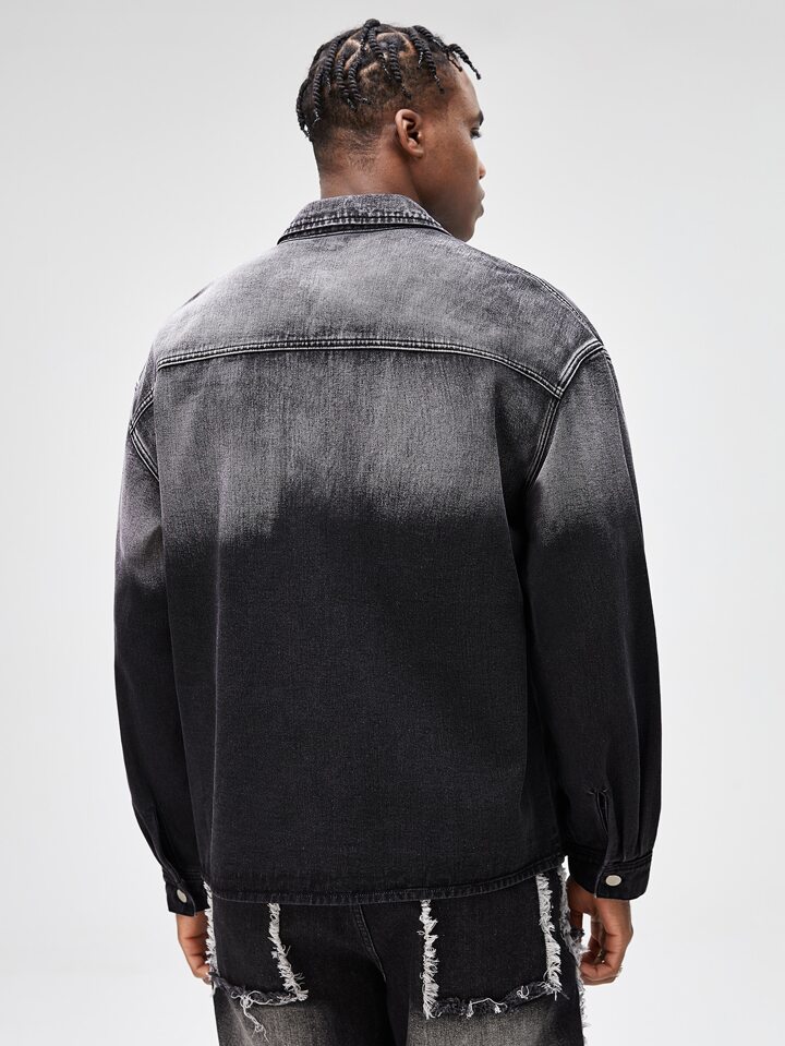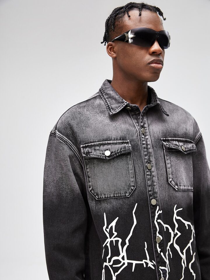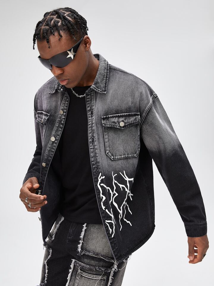 ROMWE Avant Guys Lightning Print Ombre Flap Pocket Denim Jacket
