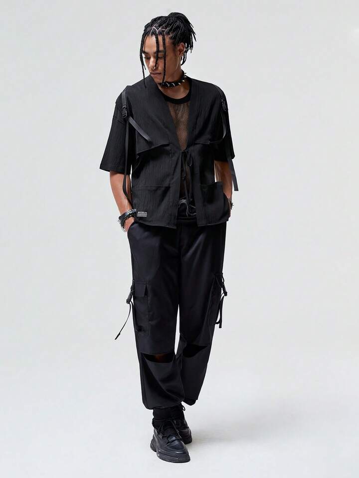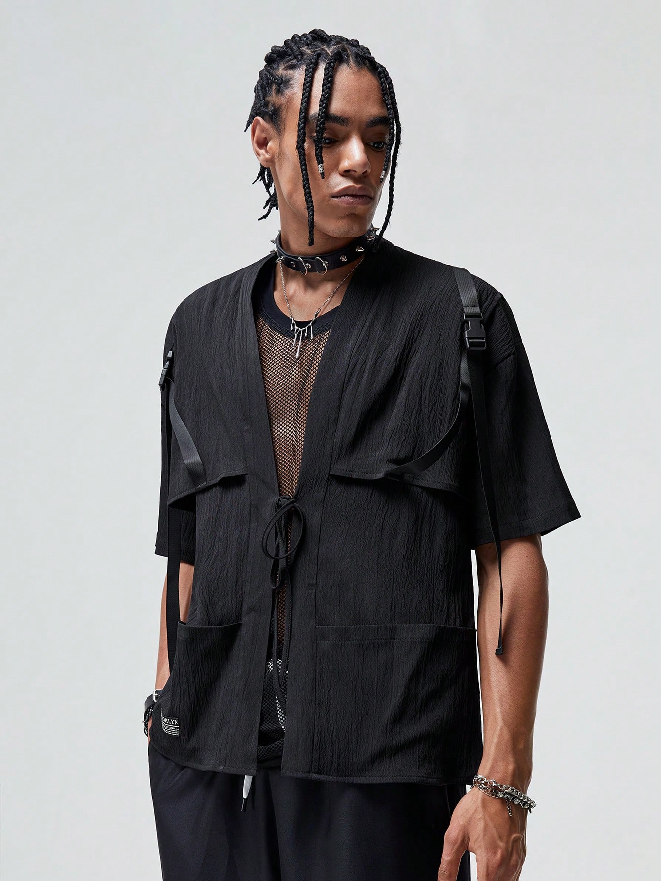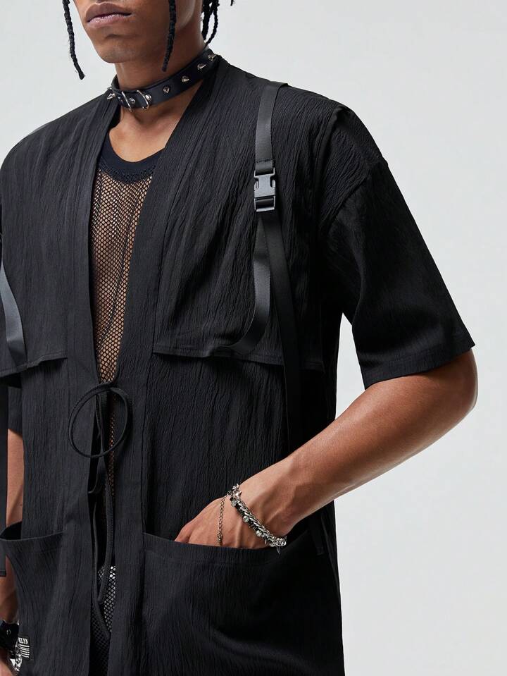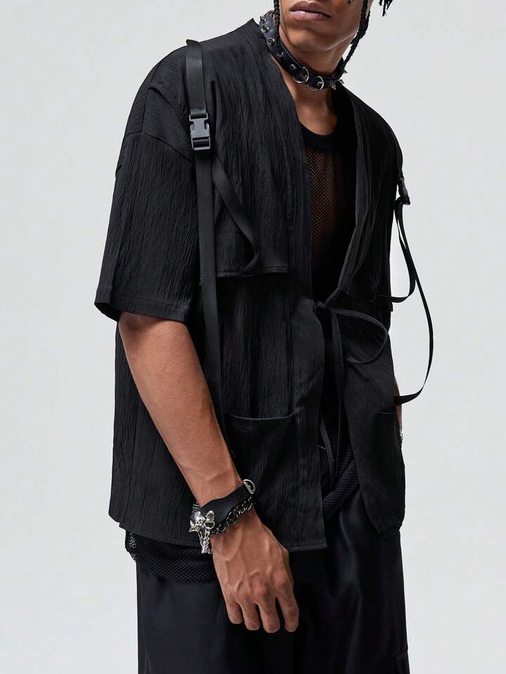 ROMWE Avant Guys Solid Buckle Detail Dual Pocket Shirt