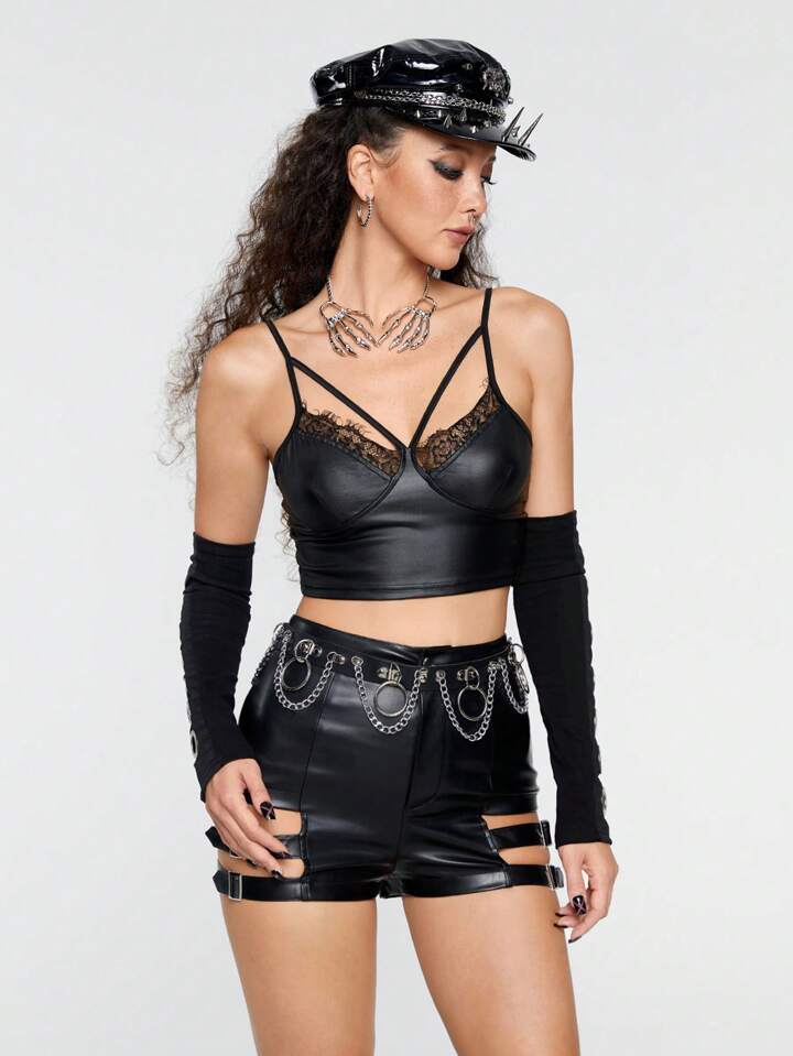ROMWE Avant Kpop Contrast Lace PU Cami