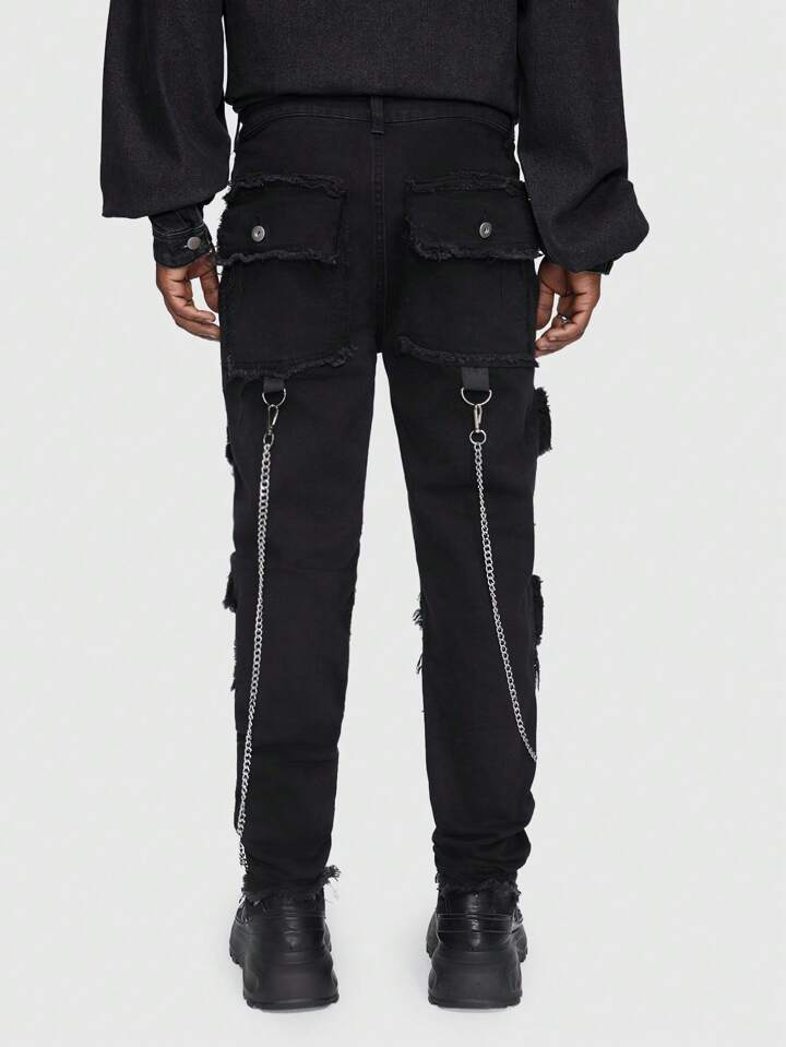 ROMWE Avant Men Chain & Flap Detail Raw Hem Skinny Jeans, School