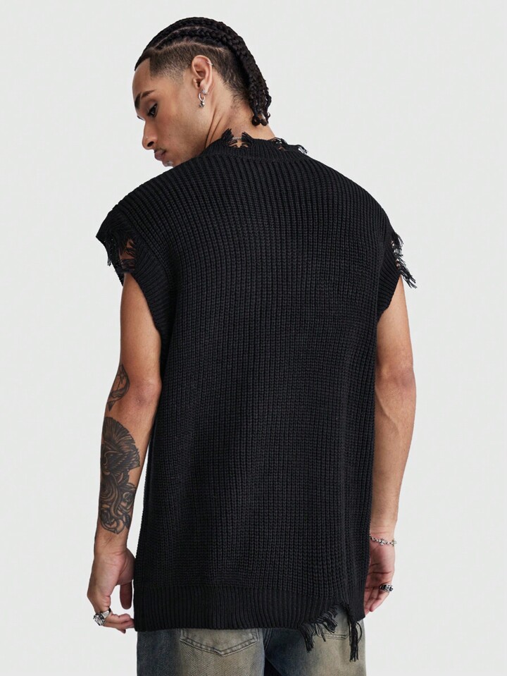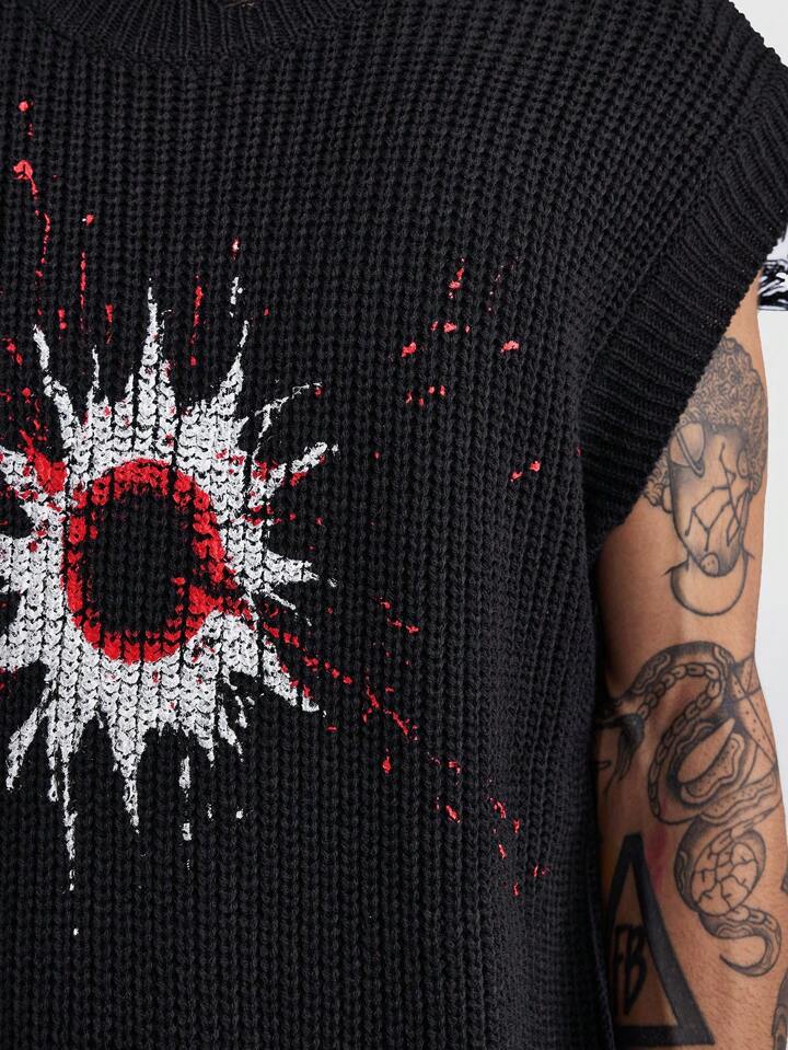 ROMWE Avant Men's Fashionable Color Block Print Distressed Hem Sweater Vest, Spring Autumn, School