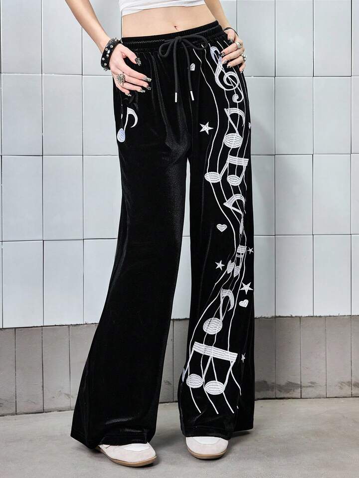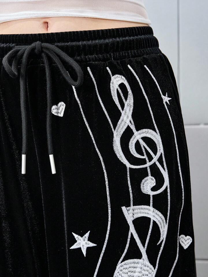 ROMWE Avant Millennium Diva Ultra Low Waist Wide Leg Musical Note Embroidered Velvet Women Sweatpants