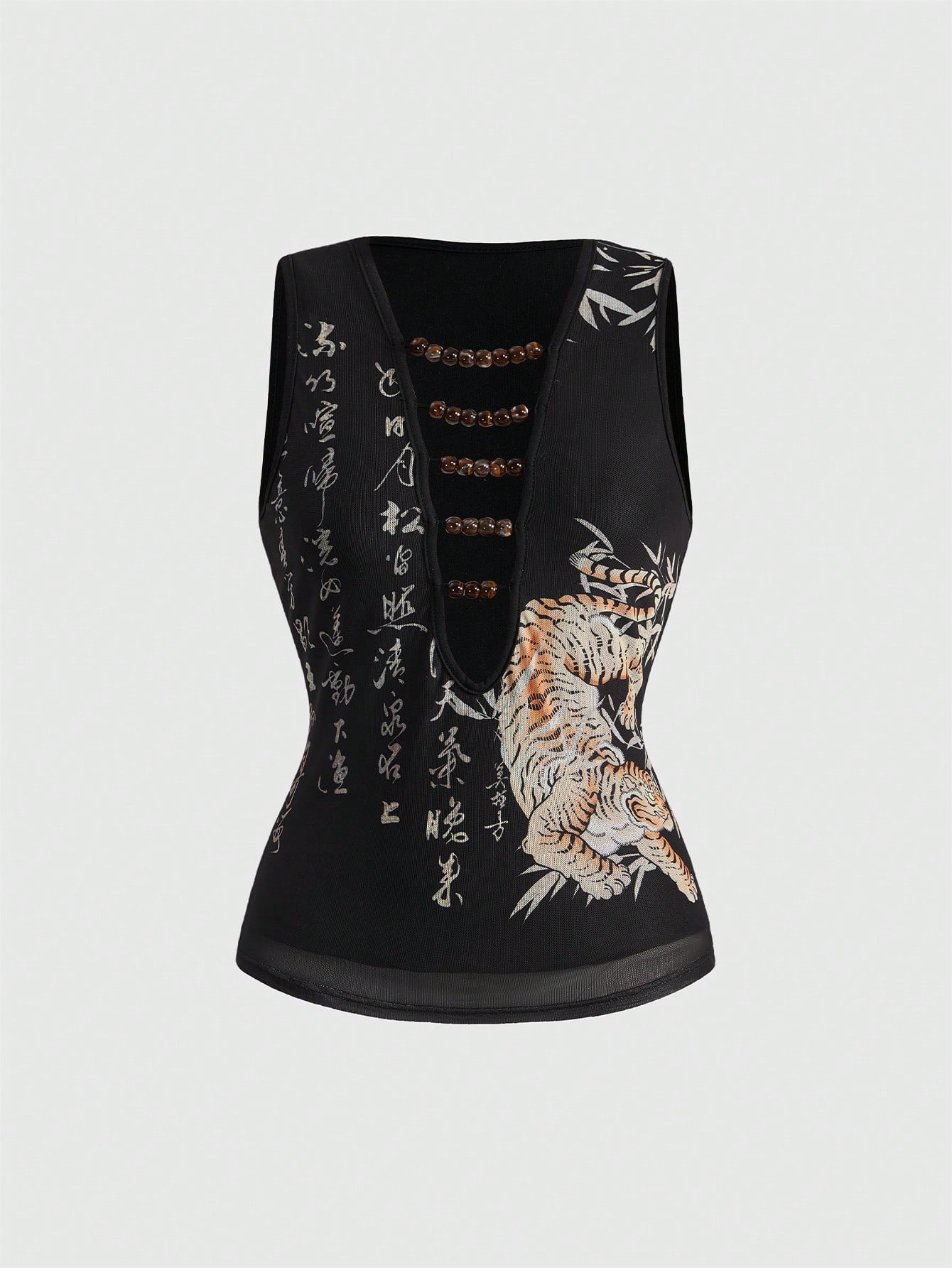 ROMWE Avant New Chinese Style Tiger & Bamboo Leaf Calligraphy Print Hollow-Out Sexy Beaded Tank Top For Women