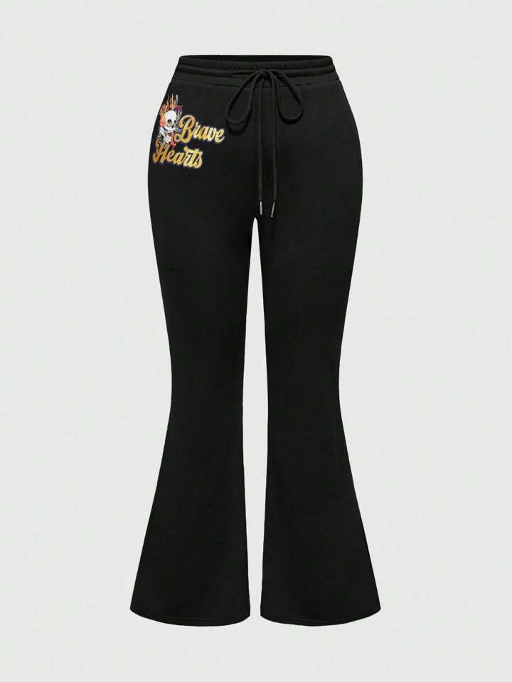 ROMWE Avant Plus Size Women Casual Vintage Skull & Flame Tattoo Print Elastic Waist Flare Leg Sweatpants