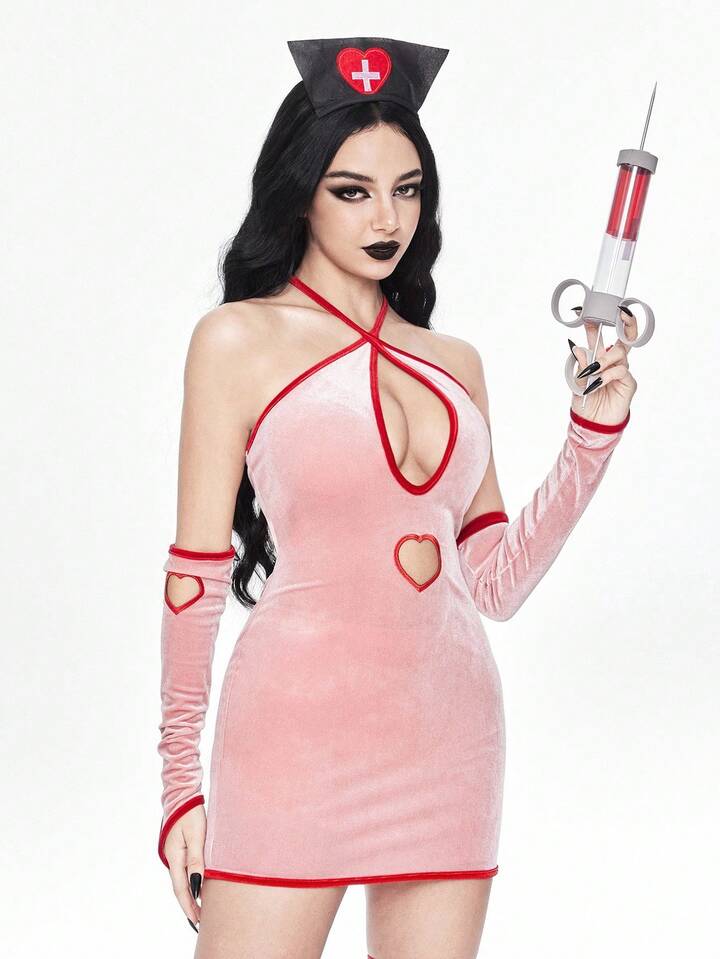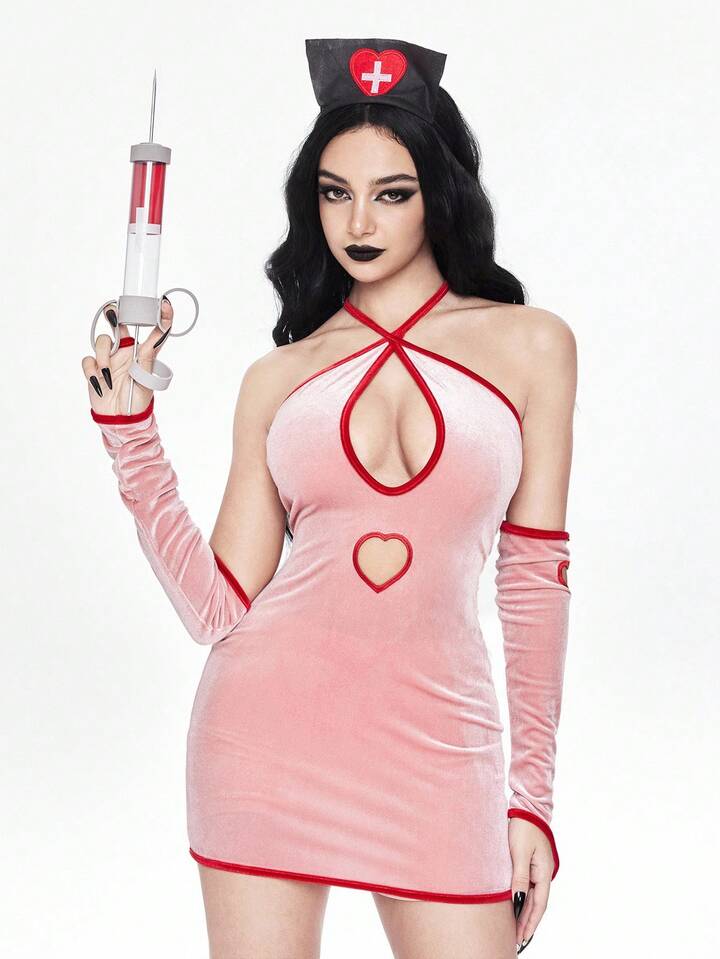 ROMWE Avant Sexy Nurse Low-Cut Crop Top With Heart Print And Tie-Up Neck, Roleplay Costume