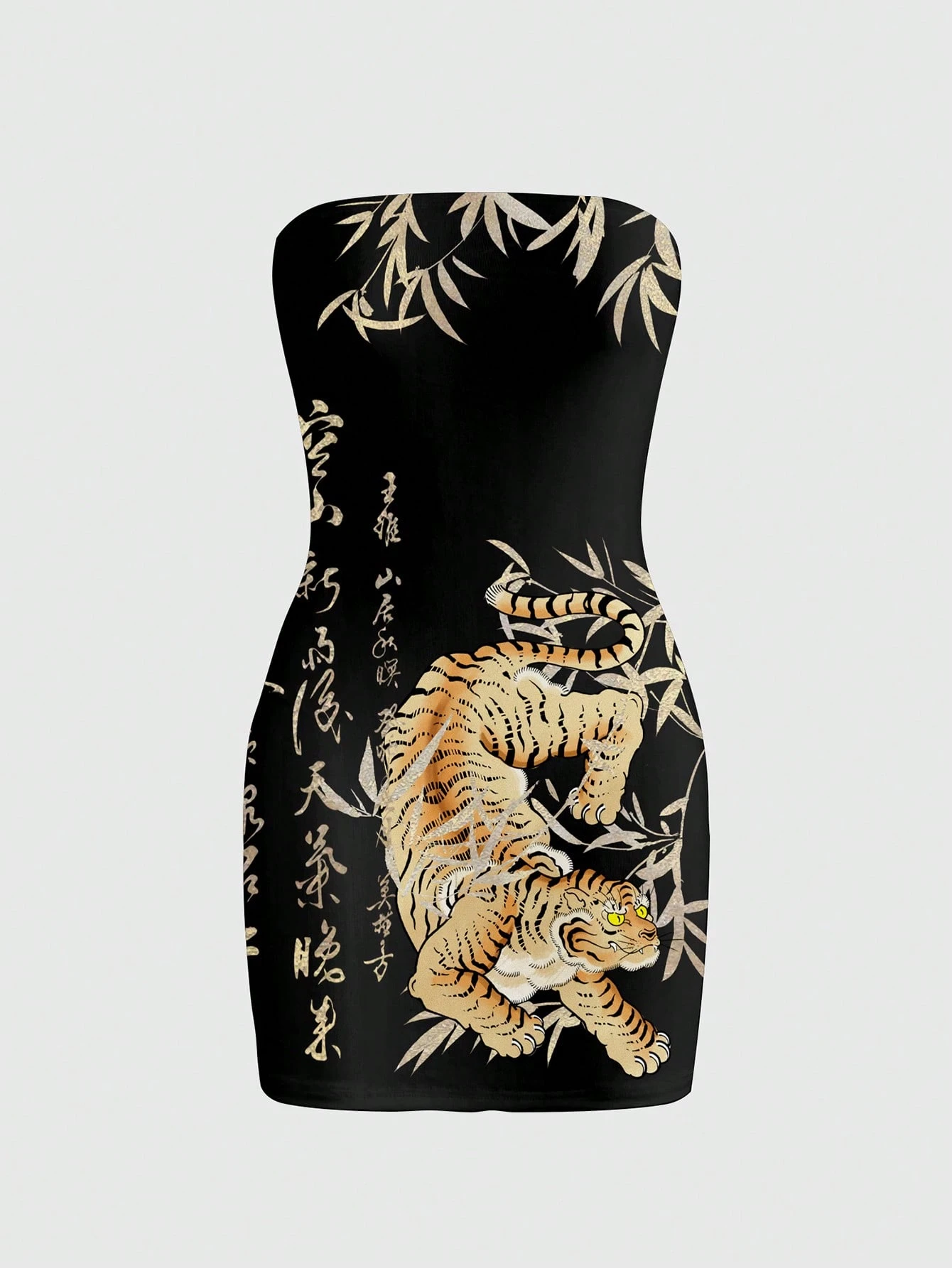 ROMWE Avant Spring/Summer Party Casual Black Baddie New Chinese Style Dark Tiger Street Calligraphy Full-Print Dark Gothic Street Vintage Baddie Tube Top Mini Dress