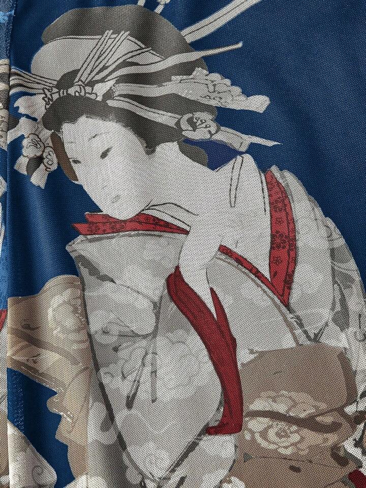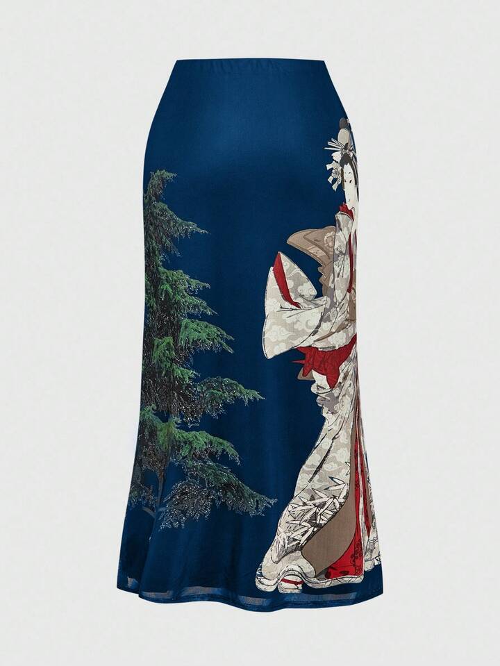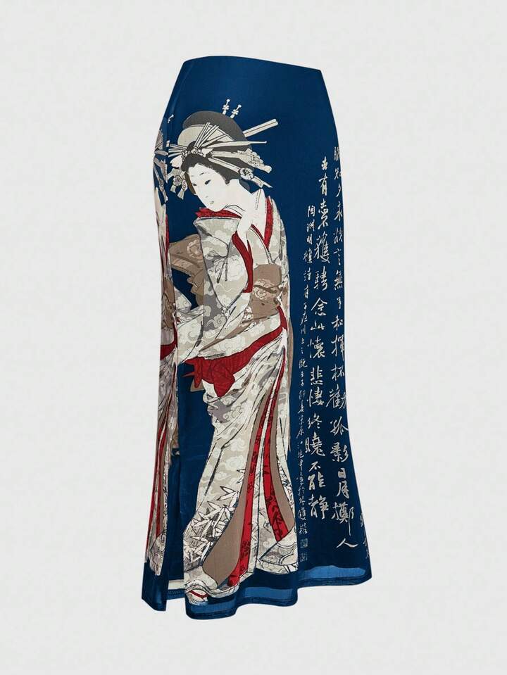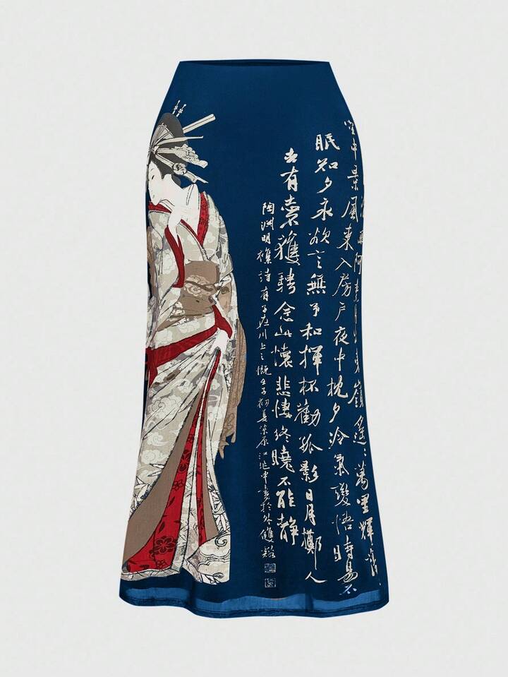 ROMWE Avant Vintage Japanese Geisha & Pine Tree Calligraphy Print Side Slit Mesh Skirt For Women