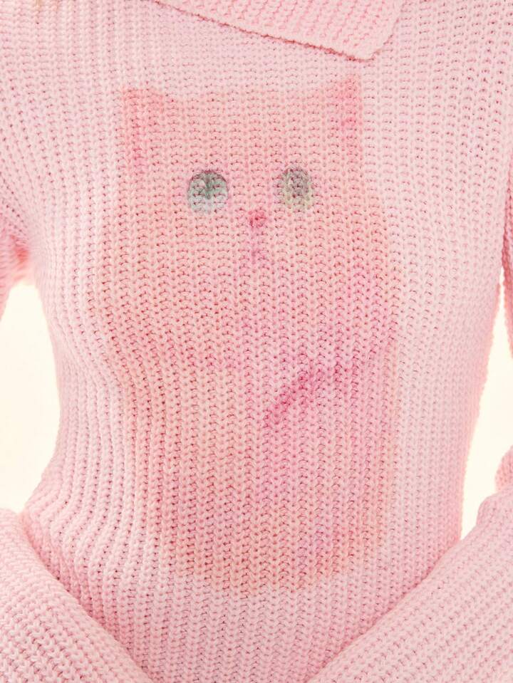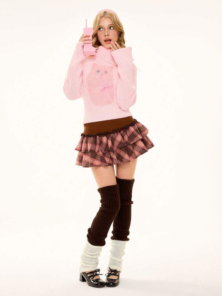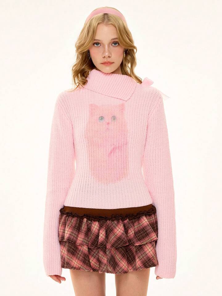 ROMWE Avant Vintage Kitty Print Bow Turtleneck Knit Sweater