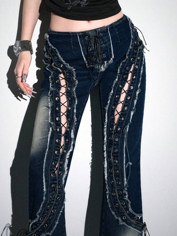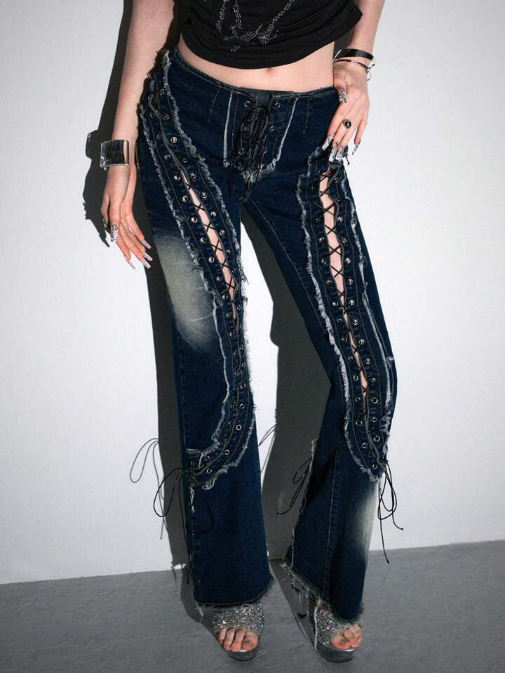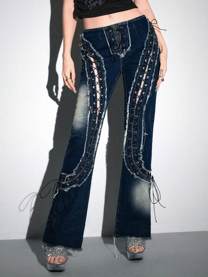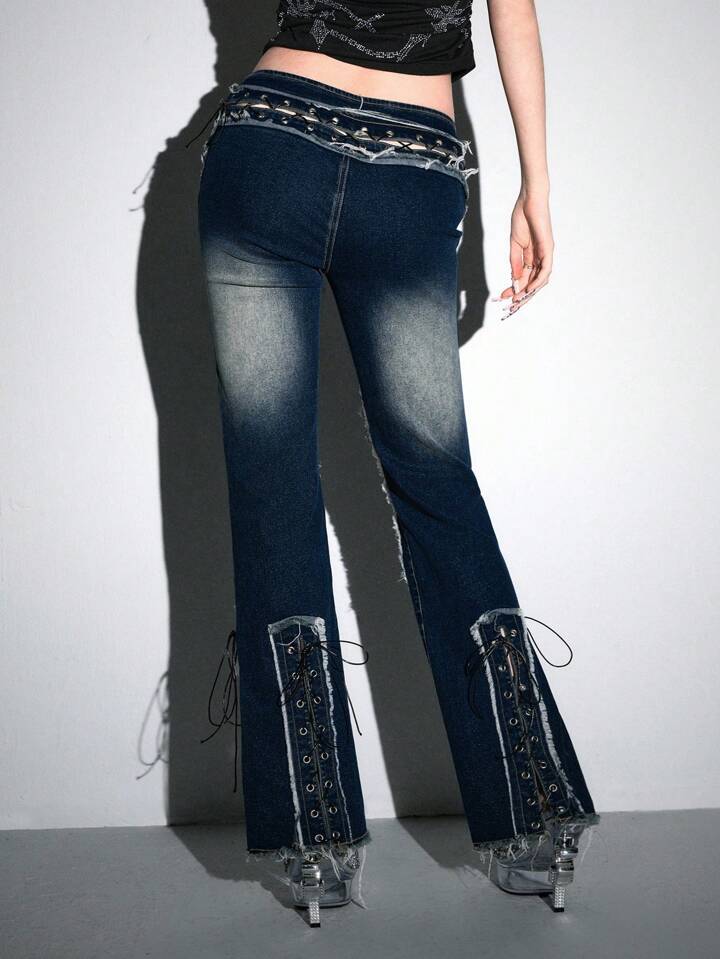 ROMWE Avant Vintage Street Style Ultra Low Waist Distressed Raw Hem Flare Women Jeans