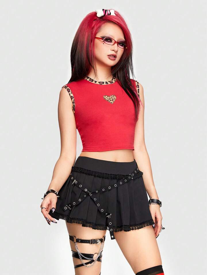 ROMWE Avant Vintage Y2k Leopard Print Splicing Heart Applique Cropped T-Shirt