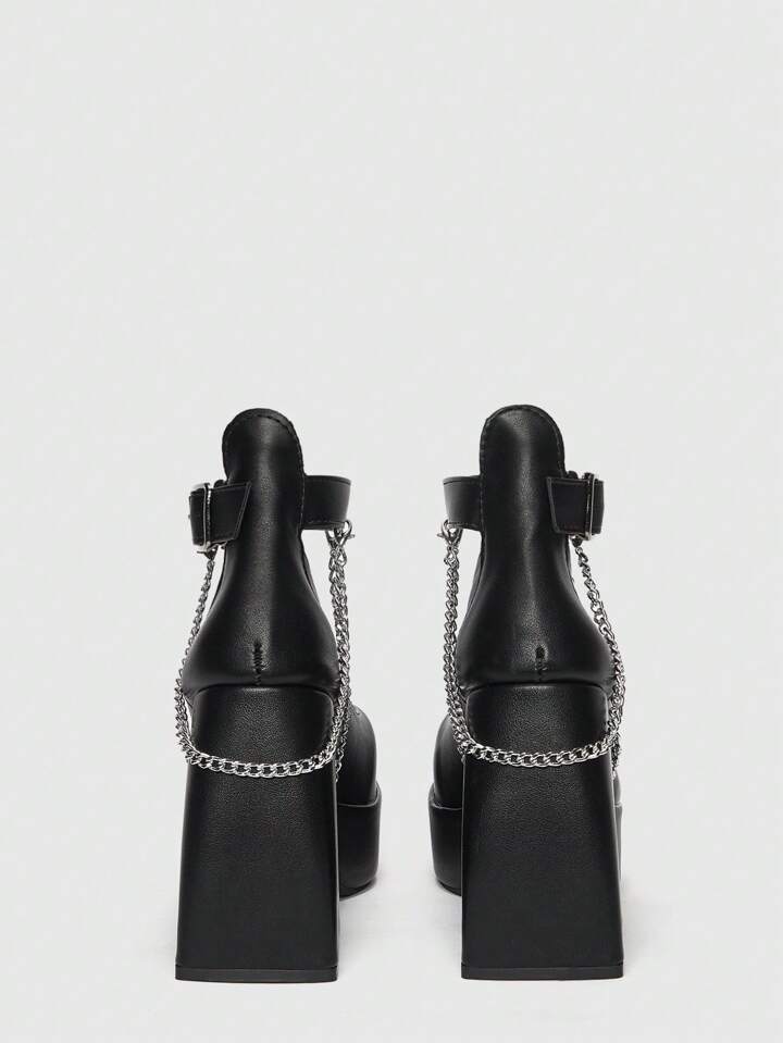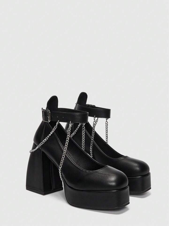ROMWE Avant Women Chain Decor Square Toe Platform Chunky Heeled Pumps, Punk Ankle Strap Pumps For Outdoor