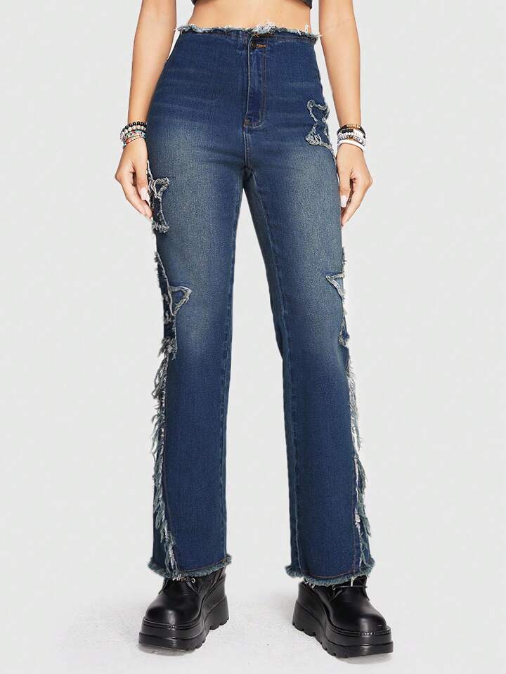 ROMWE Avant Women's Denim Jeans With Star Patches