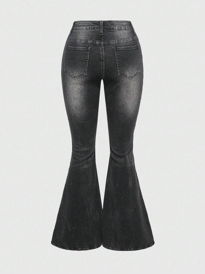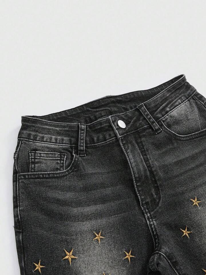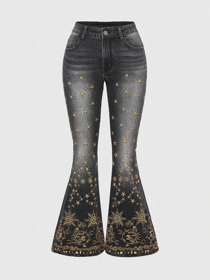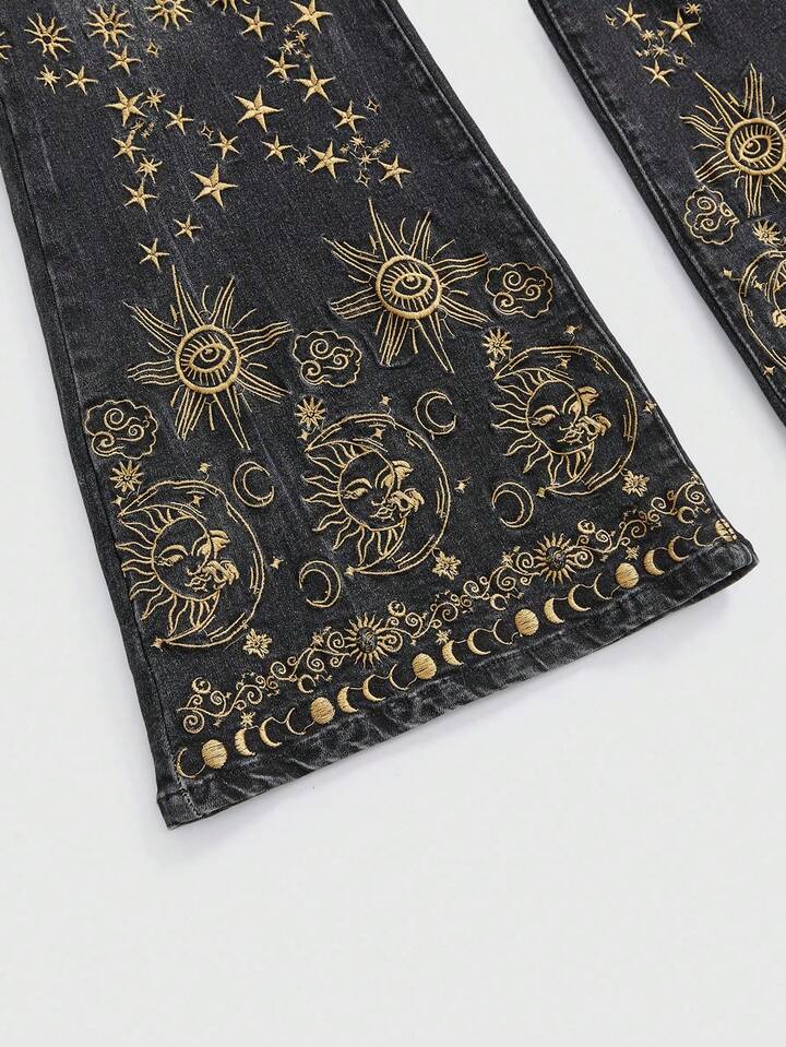 ROMWE Avant Women's Retro Hippie Sun Moon Star Embroidered Skinny Flare Jeans