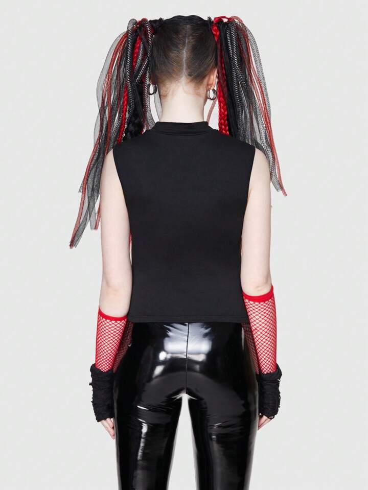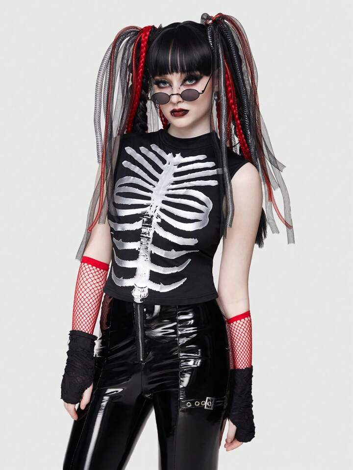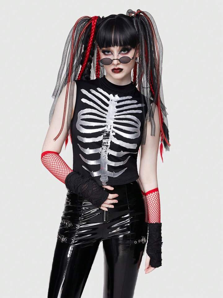 ROMWE Avant Women's Skeleton Print Stand Collar Tank Top