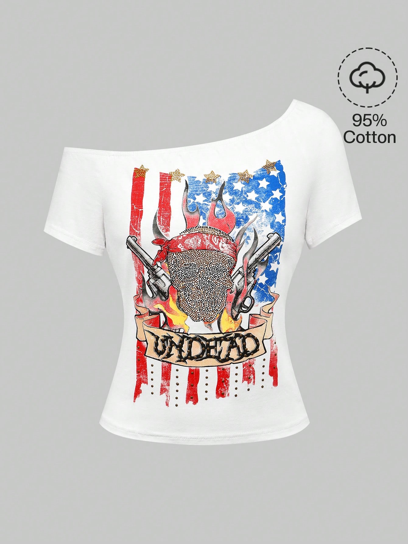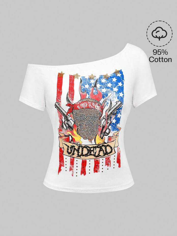 ROMWE Avant Women's Y2K Music Festival 4th Of July Asymmetric Shoulder Punk Style T-Shirt With Skull, Gun, USA Flag Rhinestone Print