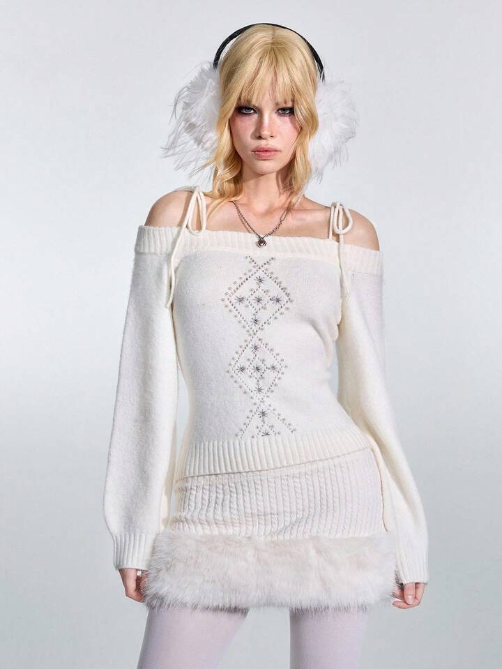 ROMWE Avant Y2K Collegiate Style Argyle Pattern Off Shoulder Tie-Up Sweet Fitted Fuzzy Knit Sweater For Women
