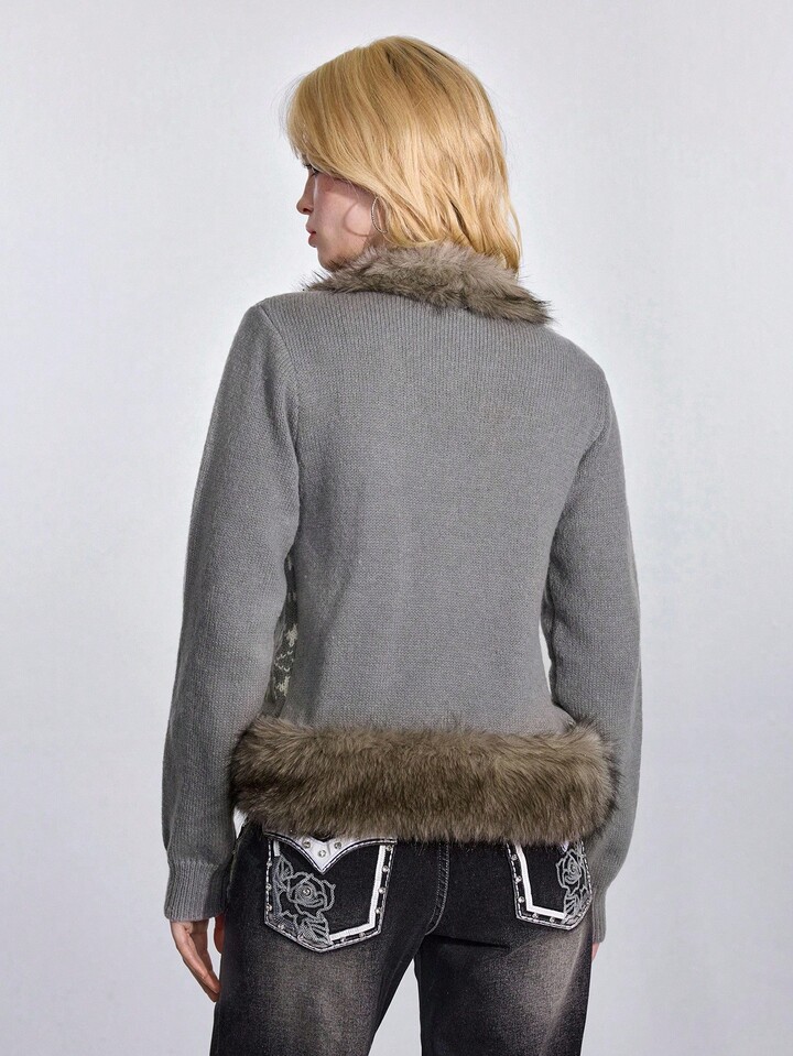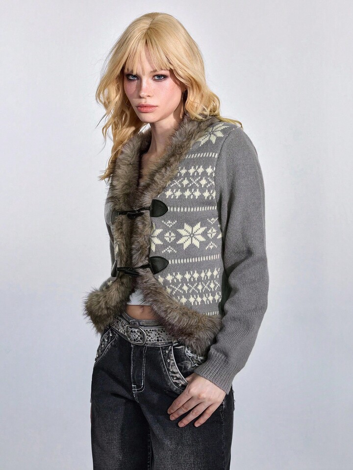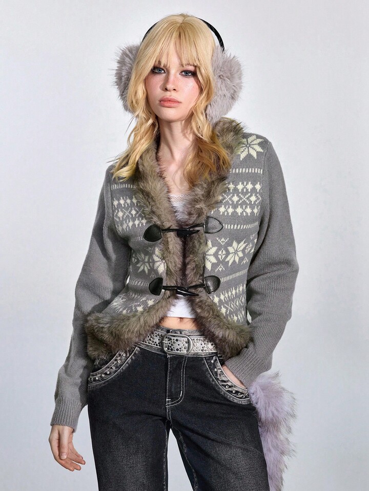 ROMWE Avant Y2K Fair Isle Knit Jacquard Wool Blend Cardigan Sweater With Horn Buttons, Long Sleeve