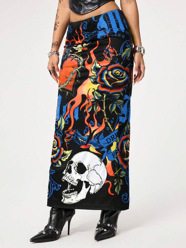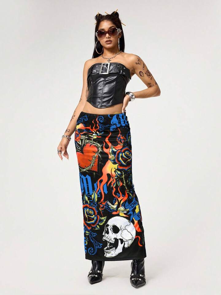 ROMWE Avant Y2K Retro Baddie Skeleton Heart Flame Text Print Women Mini Skirt