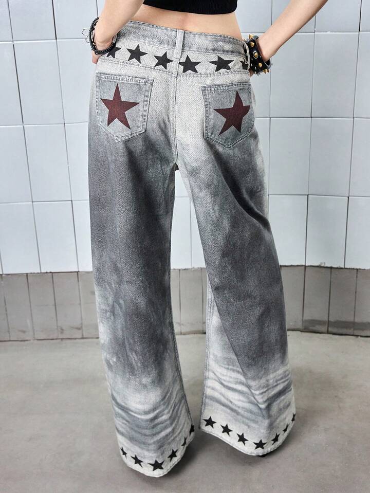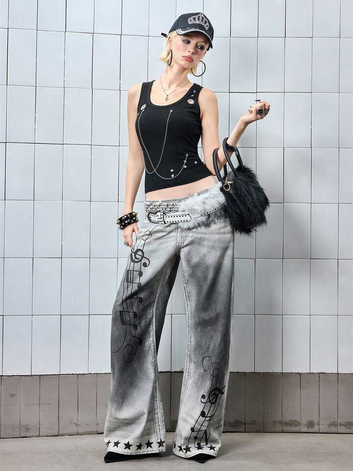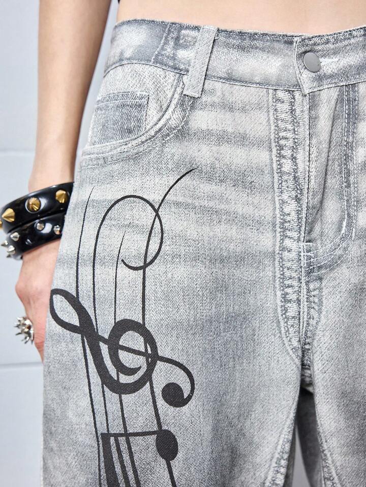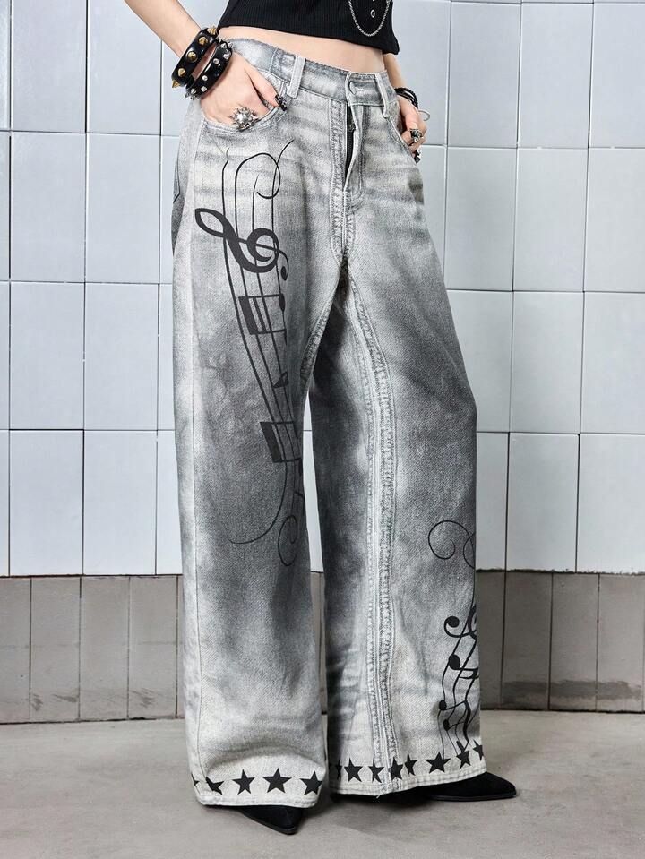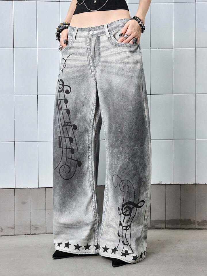 ROMWE Avant Y3K Retro Distressed Low Waist Grey Denim Jeans For Women Kpop With Music Note Print