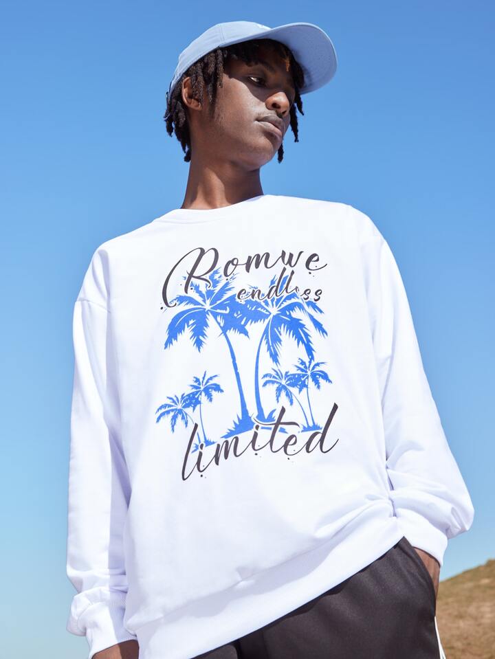 ROMWE Limited Guys Tropical & Letter Graphic Sweatshirt