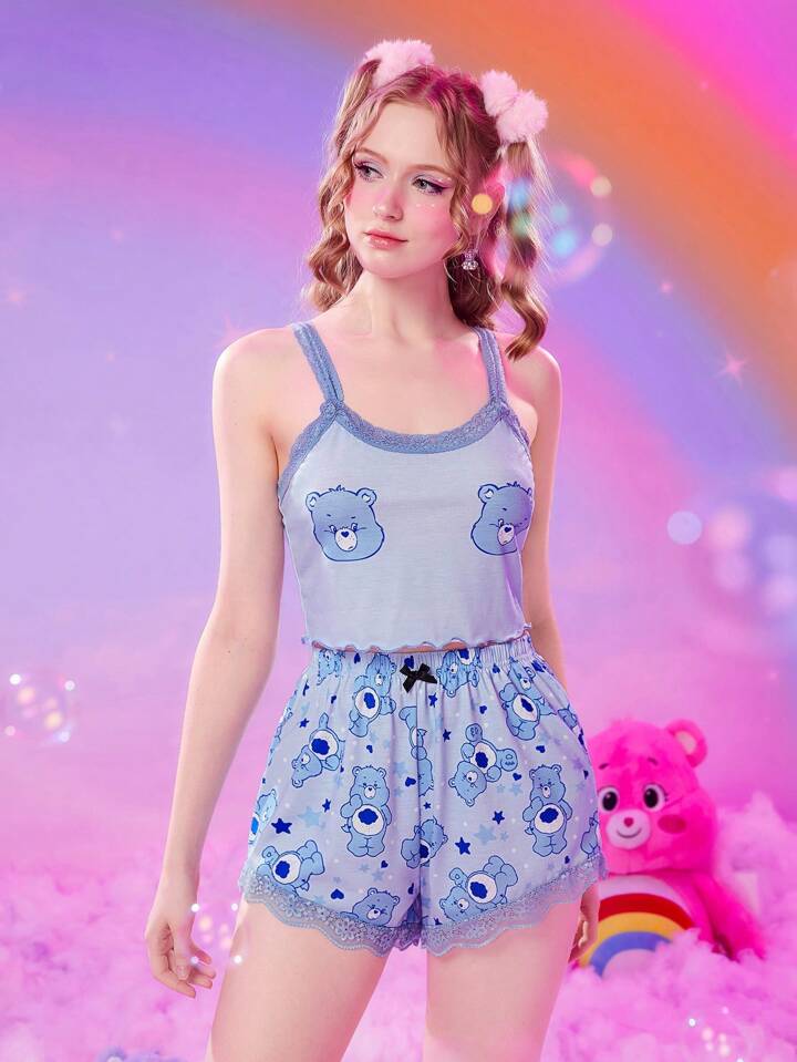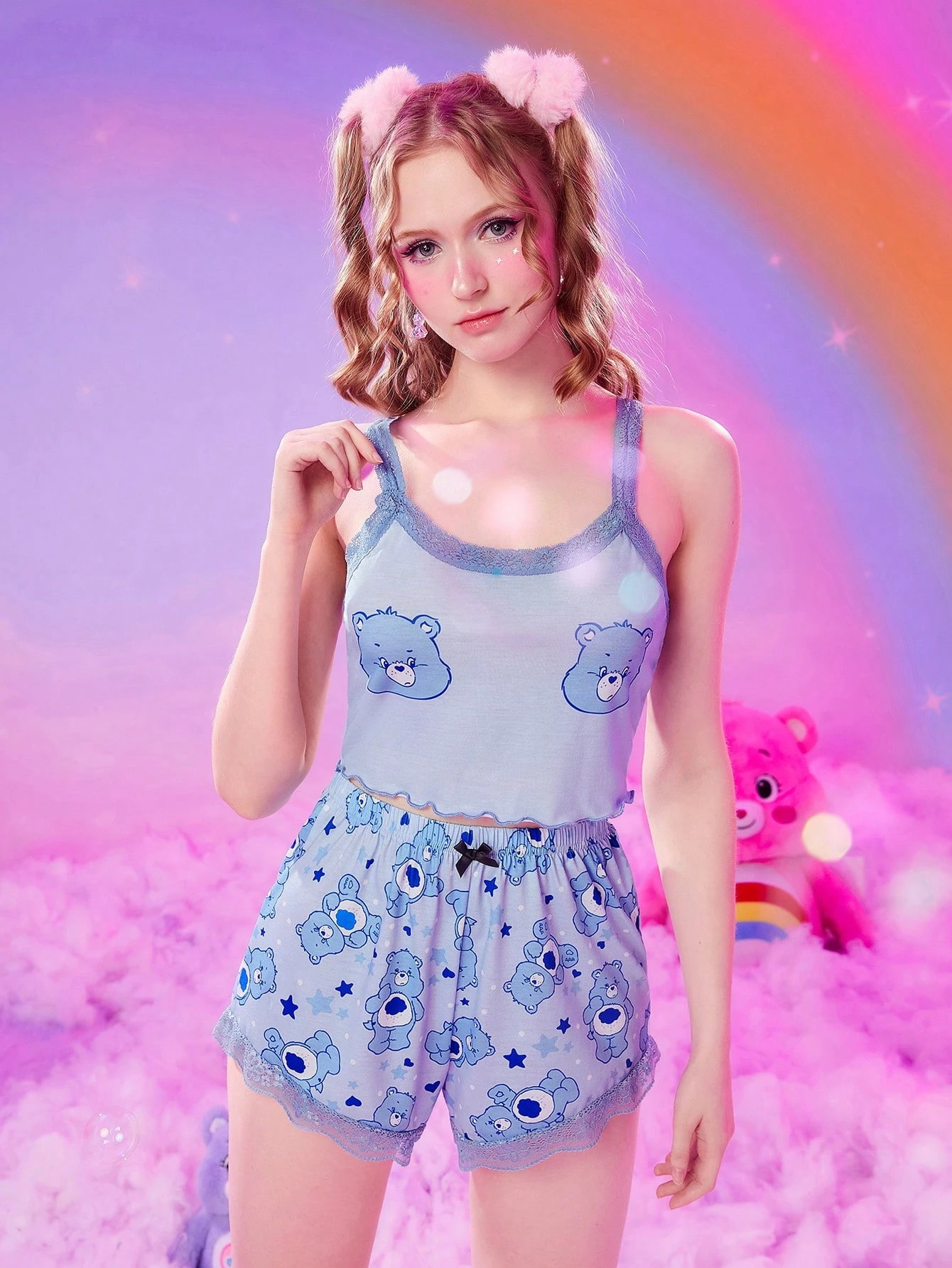 ROMWE X Care Bears Cartoon Bear Print Contrast Lace PJ Set