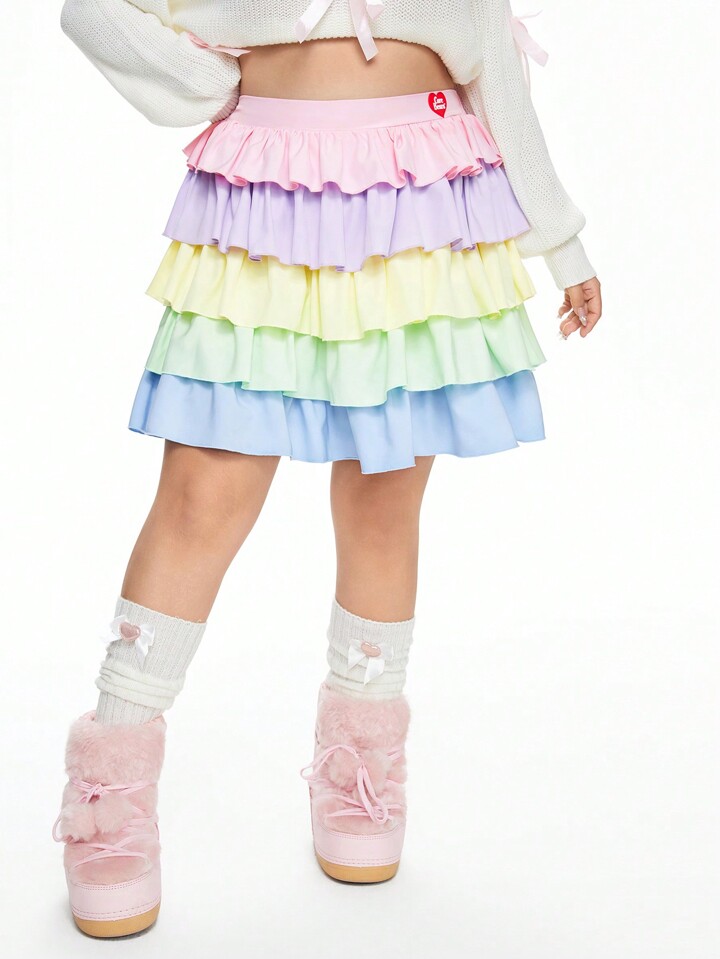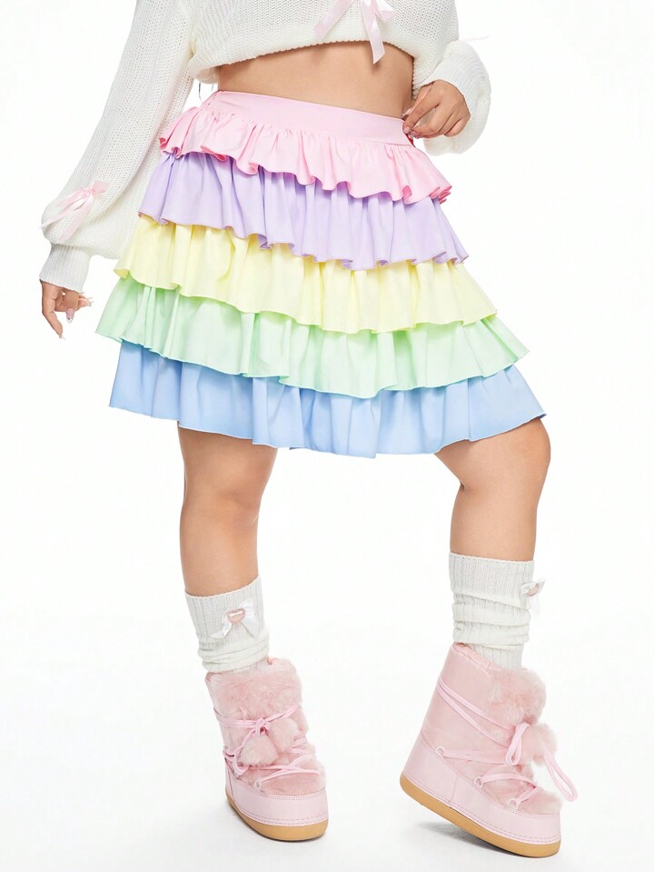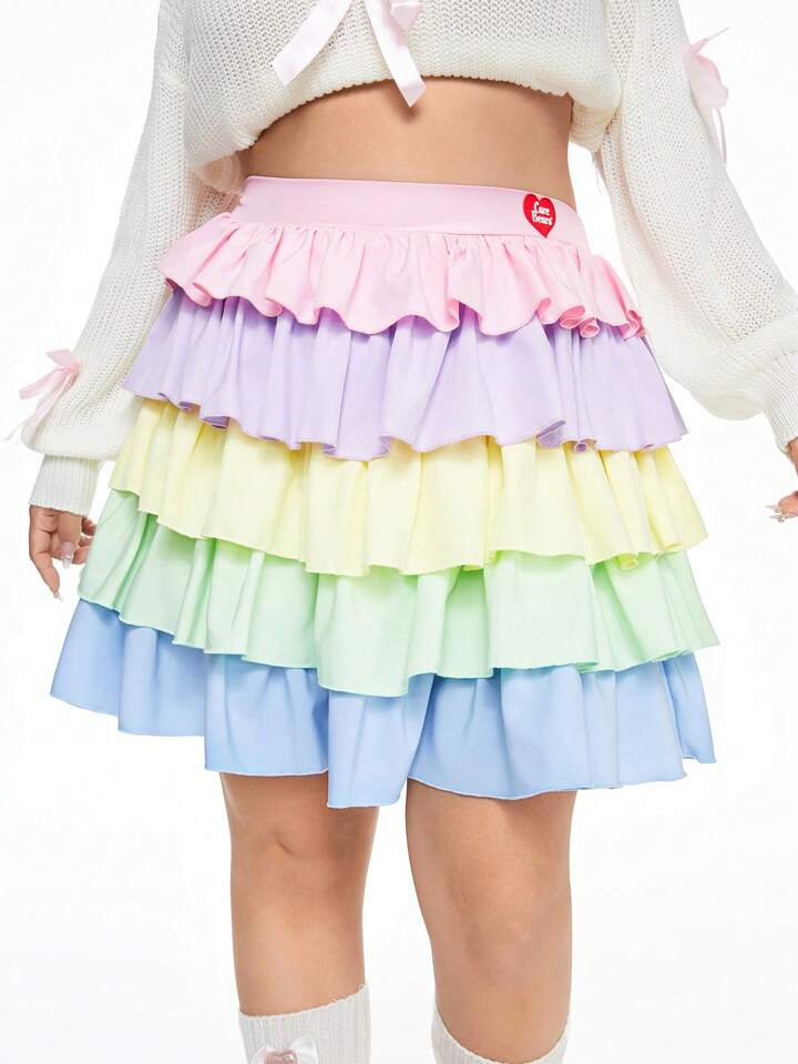 ROMWE X Care Bears Plus Size Cute Kawaii Sweet Ruffled Contrast Color Cake Skirt