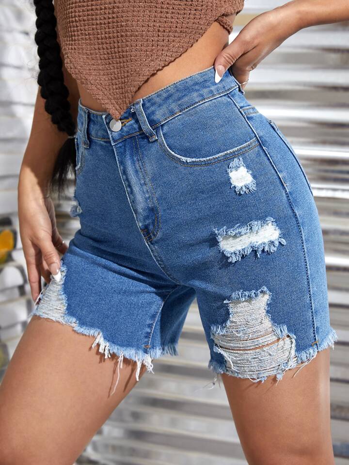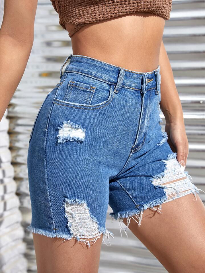 Raw Hem High Waist Ripped Denim Biker Shorts