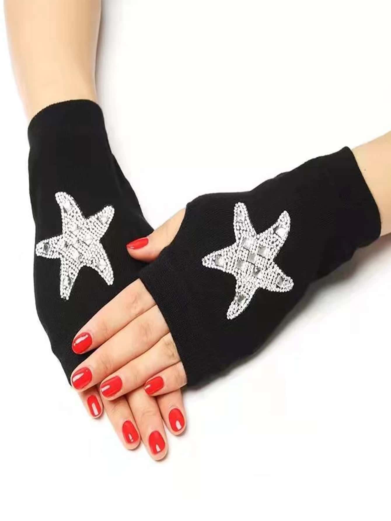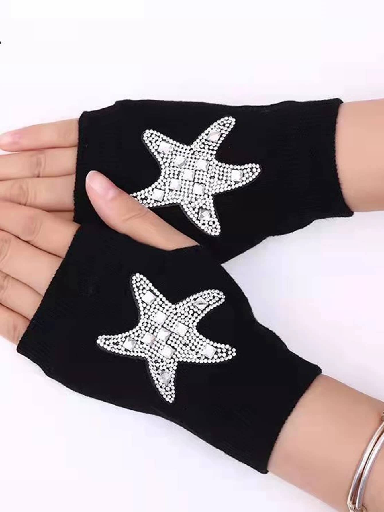 Rhinestone Decor Fingerless Gloves