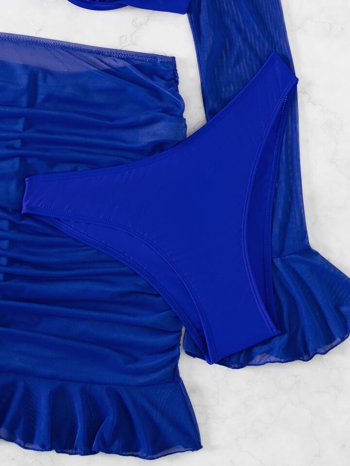 Ruched Bikini Set 2 In 1 Long Sleeve Cut Out Top & Bikini Bottom & Cover Up Skirt 3 Piece Bathing Suit
